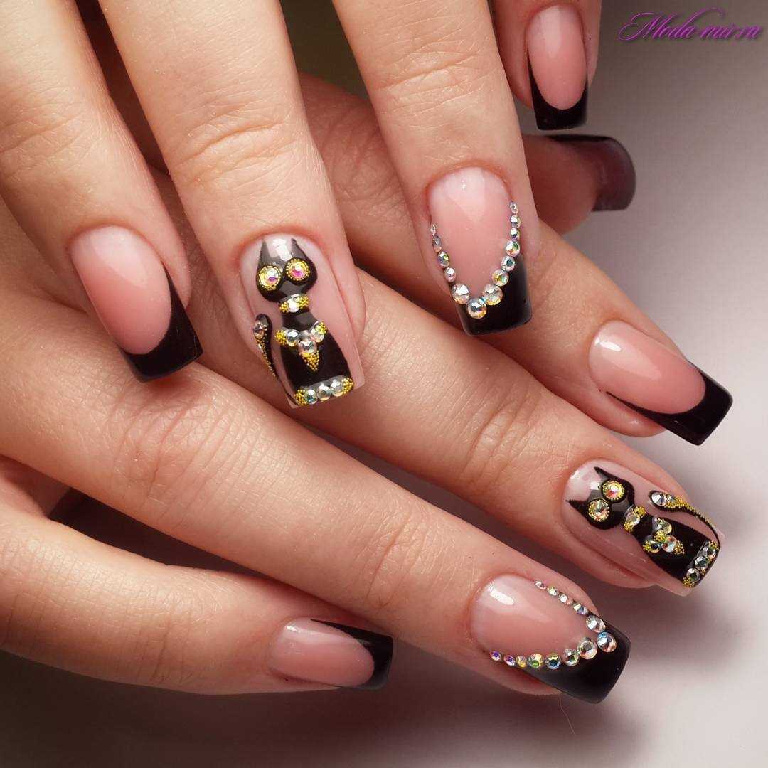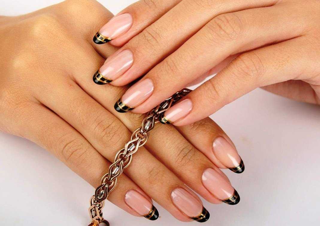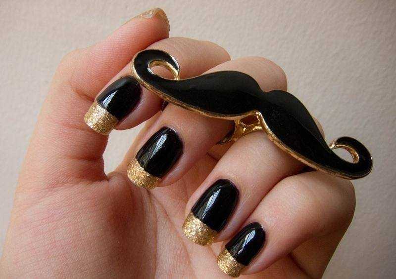Также черный и золотой цвет можно нанести на линию улыбки. То есть черный цвет выступает в качестве основы. А золотой лак или декор является акцентом во всем дизайне. Такой маникюр подчеркивает изысканность образа, поэтому его делают довольно часто.