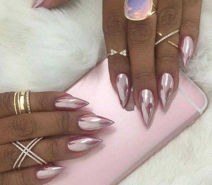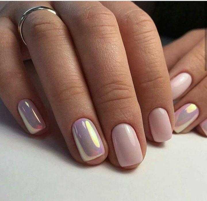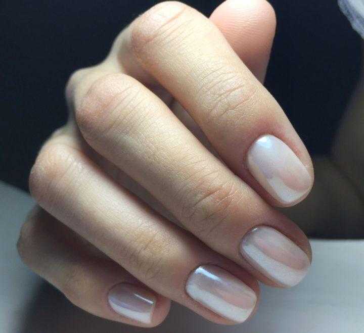 Жемчужная втирка отлично будет смотреться на разной длине ногтя и такой вариант будет особенно модным в 2022 году.