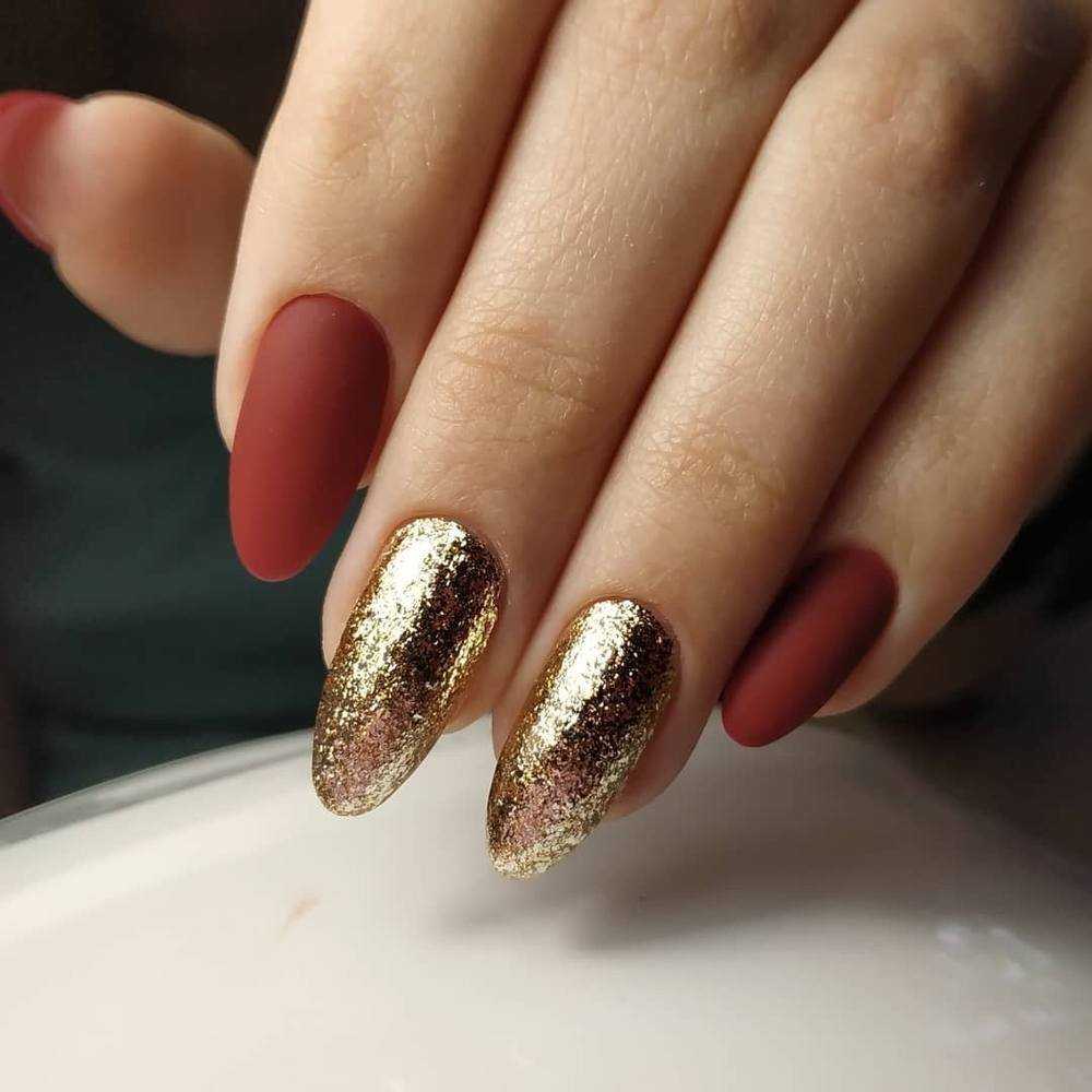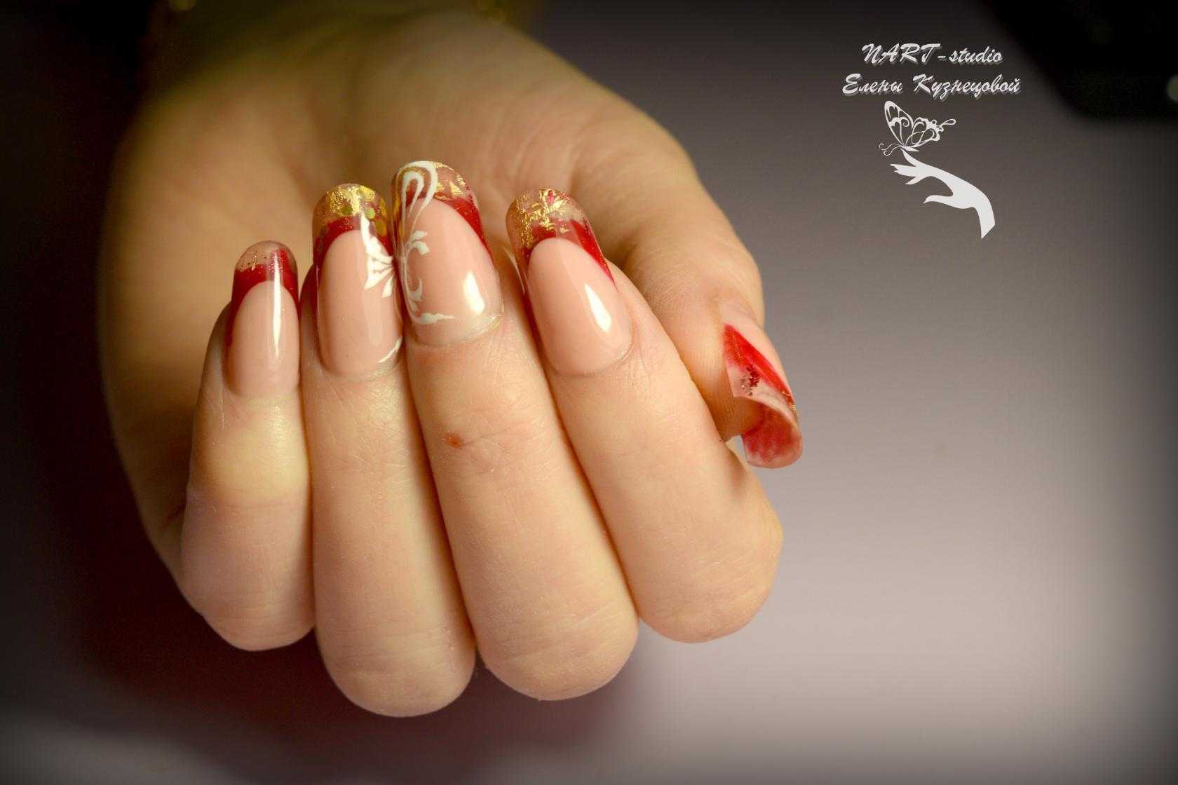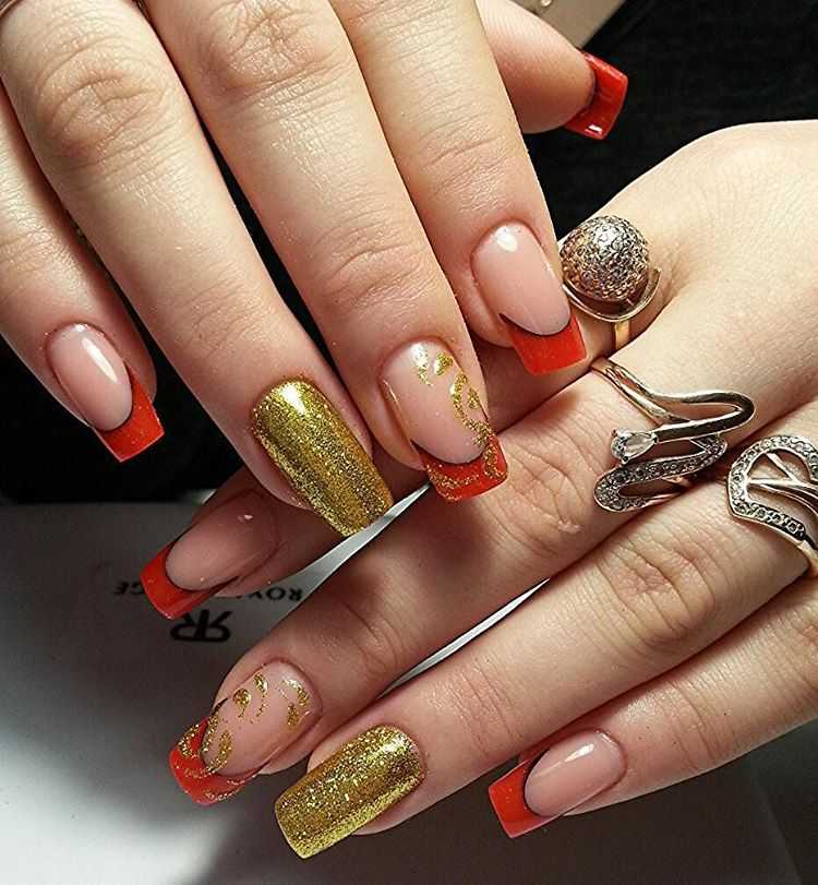 Успех будет иметь и дизайн, в котором золотистый френч соседствует с однотонным красным покрытием. Маникюр подчеркнет сексуальность девушки, раскроет ее уверенность в себе. Под такие ноготки останется лишь подобрать платье, подчеркивающие изгибы фигуры, чтобы получить звание королевы вечеринки на предстоящем торжестве.