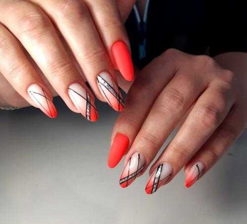 Используя контрастные цвета холодного или теплого оттенка, мастера создают интересные сочетания. Но если вы решились на красный дизайн, металлические полоски будут идеально сочетаться. Французский маникюр с рисунком – отличная альтернатива на каждый день. Рисунки при этом могут быть самыми разными. К примеру, отражать тематику сезона или настроения. Многие девушки предпочитают создавать на ногтях маникюр с цветочными узорами, буквами, животными и пр. Однако сегодня дизайнеры выступают за минимализм и рекомендуют ограничиваться лишь абстрактными рисунками, которые также не должны быть объемными. А вот маникюр с украшением из камней, страз и блесток вне моды в этом сезоне!