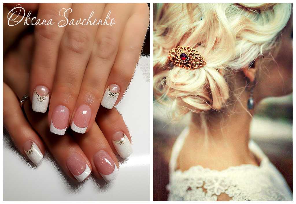 Нежный френч – лучший выбор для свадебного маникюра. Современный ажурный френч на ногтях выглядит сдержанно и скромно, без россыпи стразов и многоярусной лепки. Изысканные узоры белым лаком на бежевом или розовом фоне подчеркнут нежность и красоту невесты.