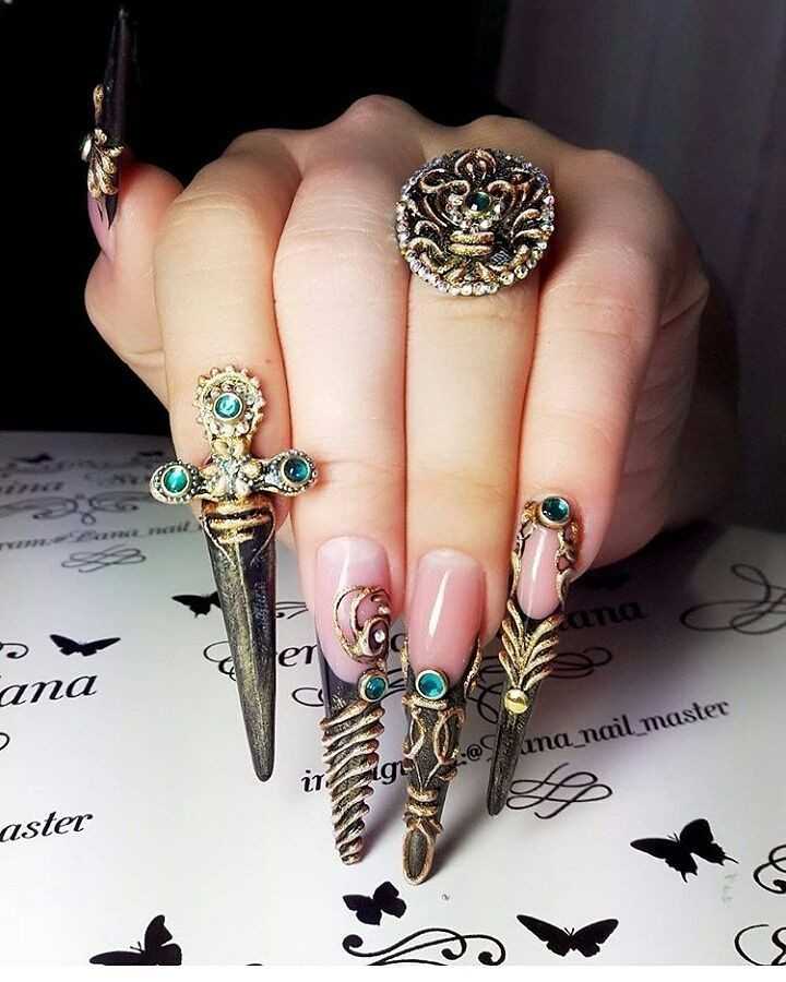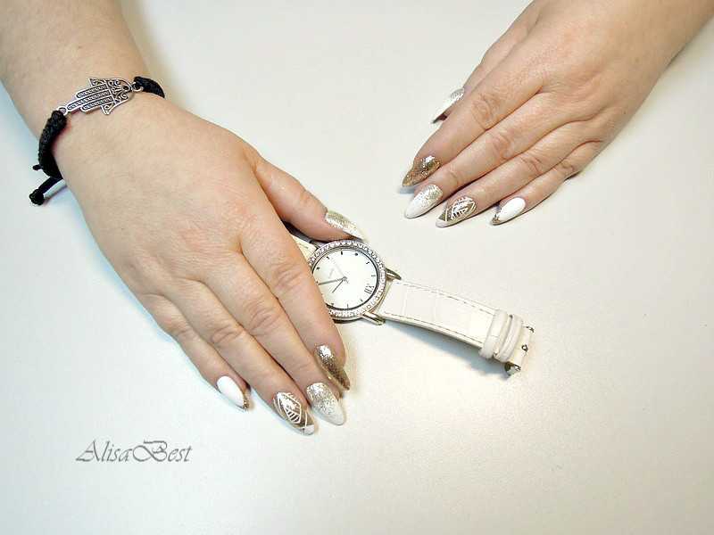 Возможна комбинация ноготков и зеркальной втирки либо этнического узора, составленного блёстками. Ещё подходят орнаменты в восточном стиле, к примеру, «турецкий огурец».