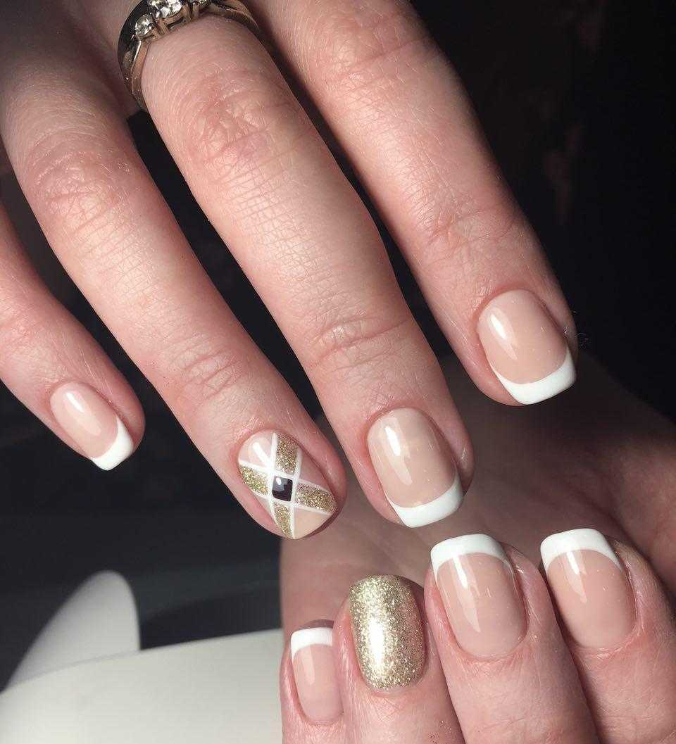 Французский маникюр нередко сочетают с геометрическим дизайном. В таком случае главным преимущественно является черный цвет. Непосредственно рисунок также может быть выполнен в данном оттенке. Золотой цвет чаще используется только в качестве акцента на ноготках, где нанесен дизайн. Благодаря такому сочетанию маникюр получается сдержанным, но при этом ярким.