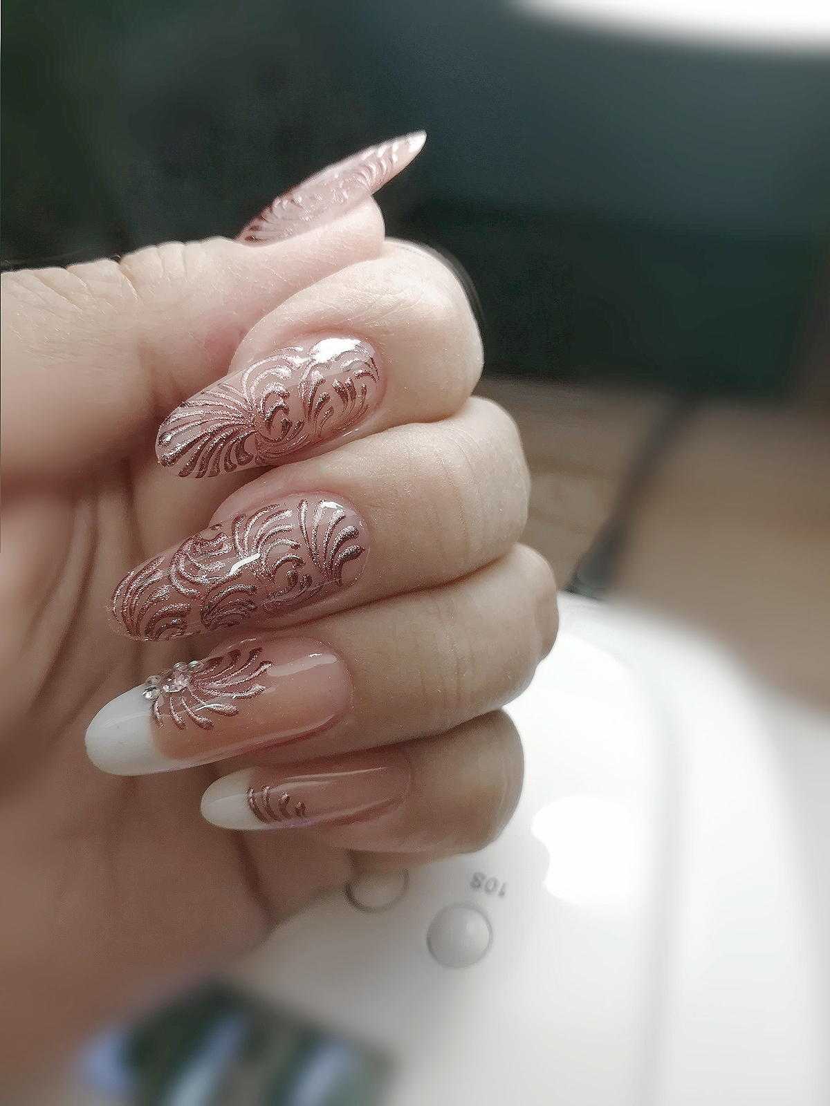Также очень стильно и нежно смотрится нюдовый дизайн в сочетании с симпатичными узорами из цветов, веточек, геометрических фигур, втертых капель, перепелиным узором или абстракцией.С нюдовым дизайном очень красиво смотрится матовый топ, как на одном или нескольких ногтях, так и в дизайне «разные руки». Также очень нарядно и мило смотрится, если добавить небольшое количество фольги, блесток или несколько страз, как легкое украшение для нюдового дизайна