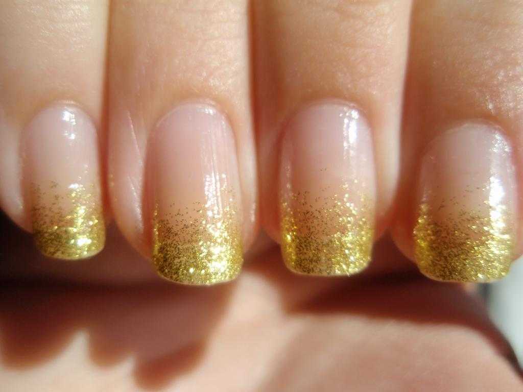 Изысканный и красивый вид имеют классическое омбре и глянцевое покрытие, переходящее к блёсткам.