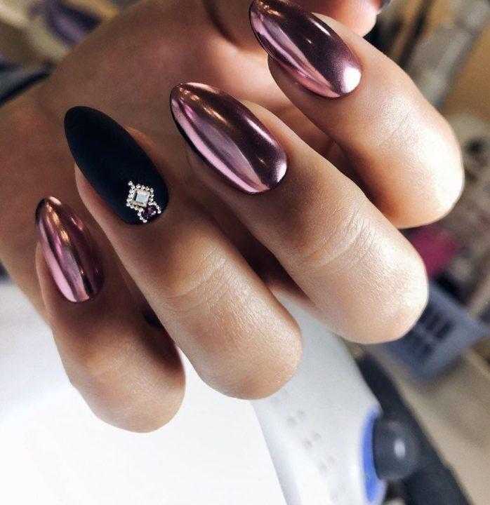 Если добавить кусочки фольги, то получится довольно лаконичный, но вместе с тем необычный и притягивающий внимание цвет. Вовсе не обязательно выполнять на все ногти