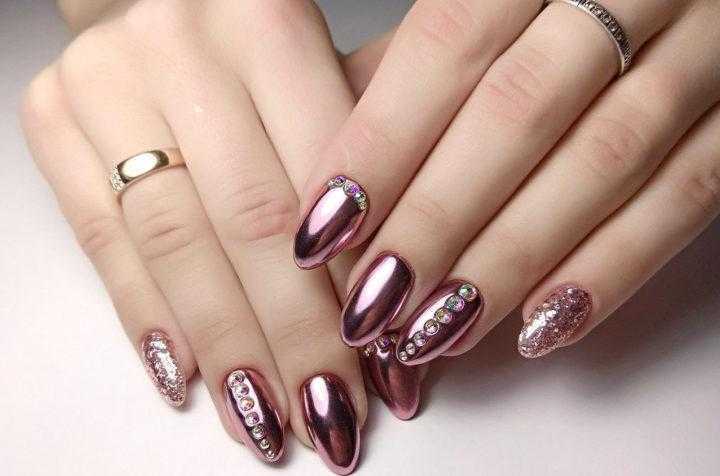 В этом сезоне ногти зимой украшают фольгой, металлическими полосками, обширными украшениями и блестками.