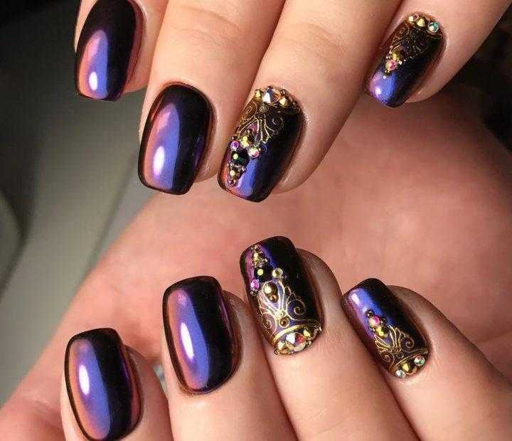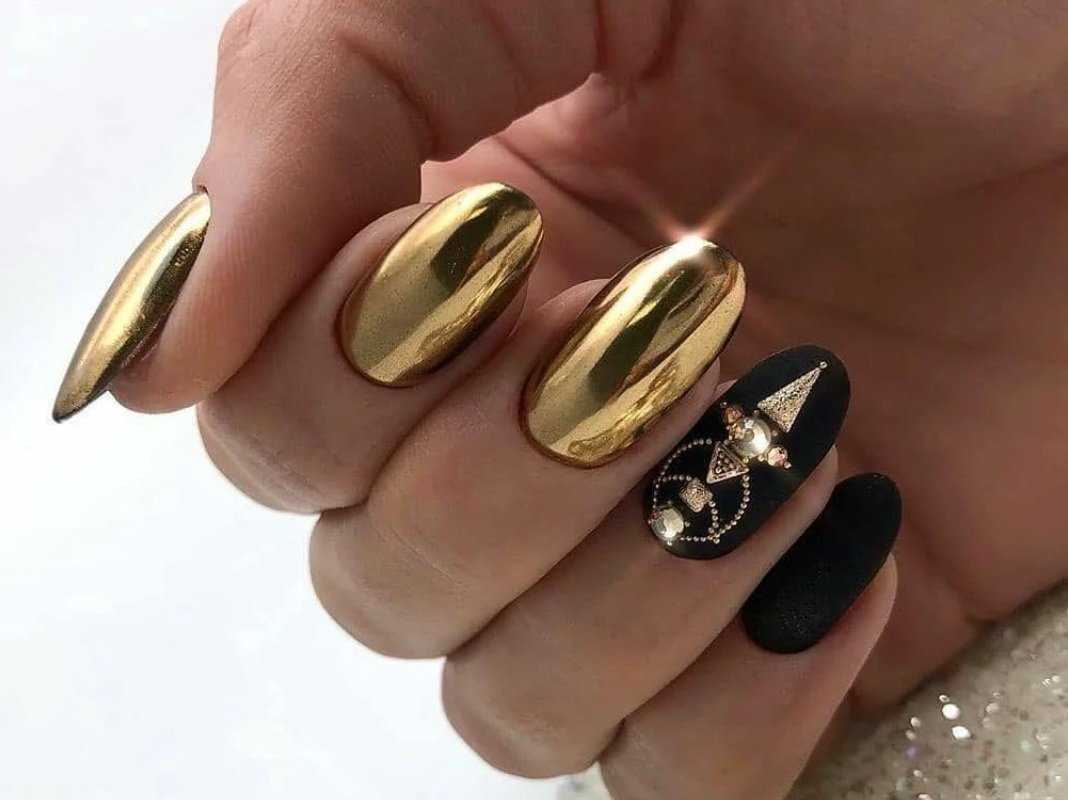 Черное золото. Еще один интересный праздничный и яркий Нейл-арт. Основа — черный цвет и золото. Элегантно и экстравагантно. Идеально для длинных или квадратных с закругленными кончиками. Такой вариант трендовых ногтей не нуждается в дополнительных украшениях. Хорошо подходит для создания вечернего образа.