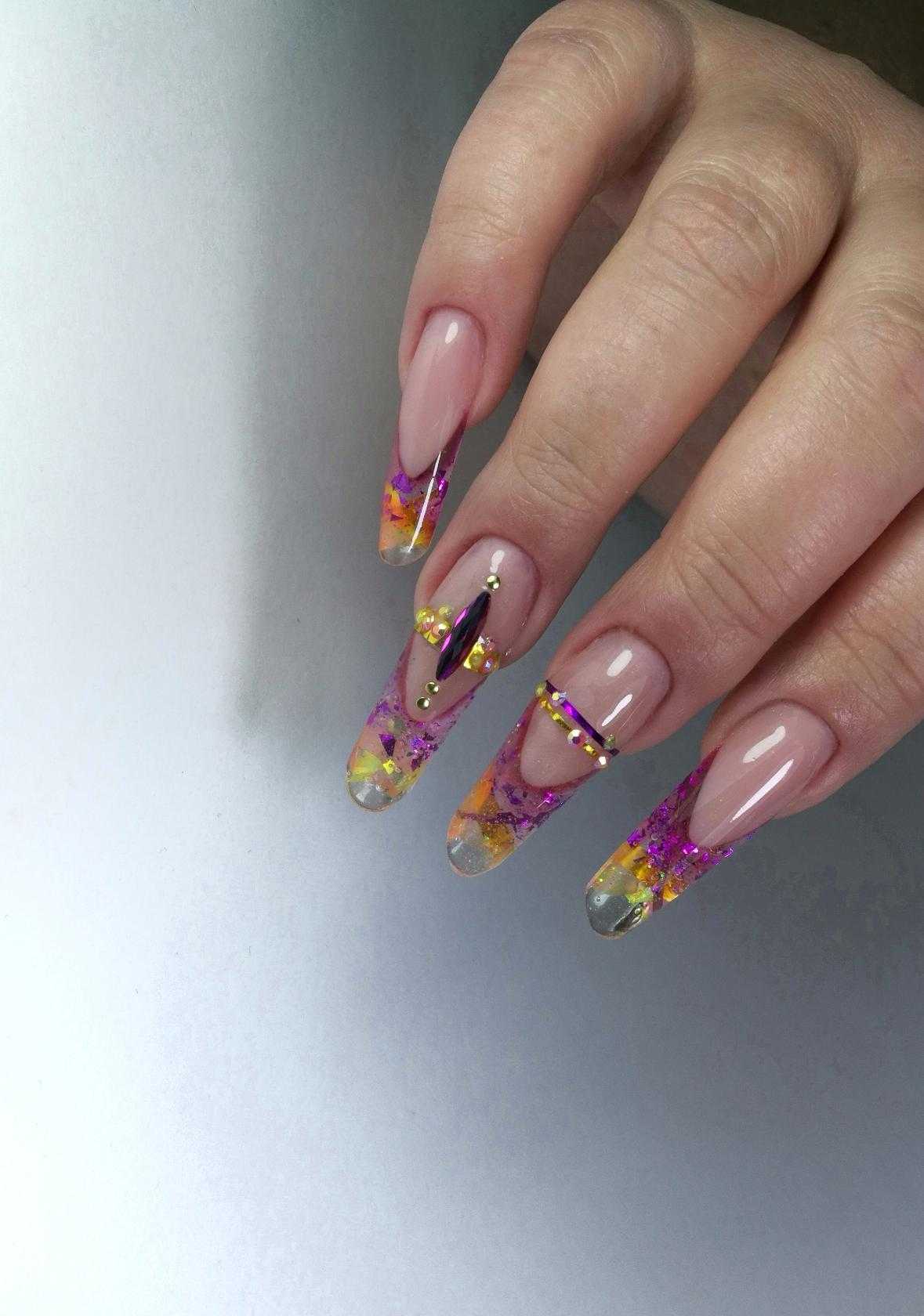 Френч 2022, фото новинки которого вы сможете увидеть в статье далее, часто соединяет в себе разные стили, например такие техники как «луна» и «битое стекло».