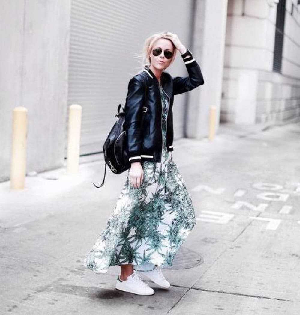 Удобный лук можно составить из платья-комбинации с кожаной курткой и кедами. Пижамный стиль сегодня в моде. Почему бы и нет?