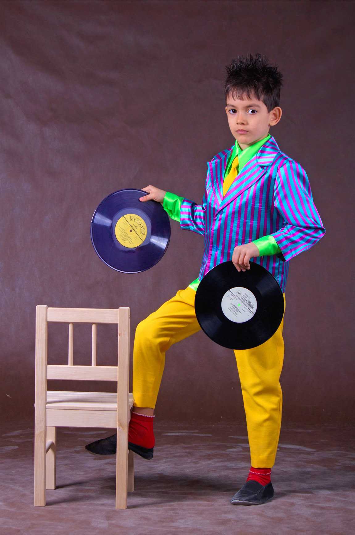 - Для детей школьного возраста выбираются зауженные пурпурные брюки, которые эффектно смотрятся с ярко-желтой шелковой рубашкой и полосатым бомбером. Под цвет рубашки подбирается галстук или бабочка. Подойдет обувь из черной кожи с блестящей поверхностью.