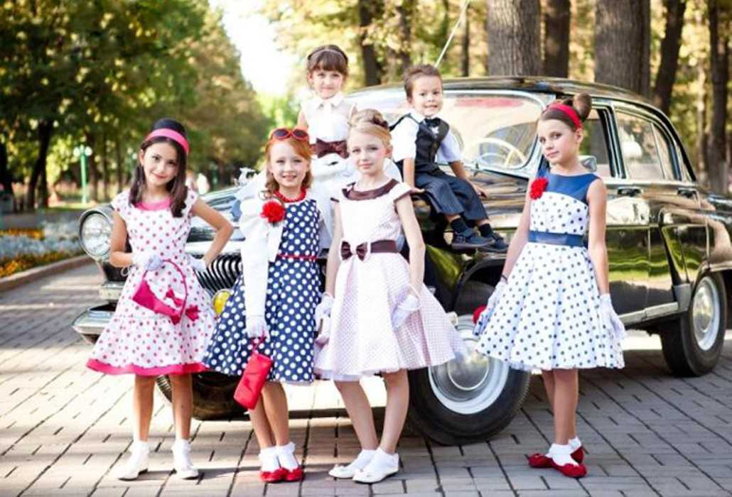Этот стиль восходит к 20 веку, когда все начали вставать на ноги вскоре после войны. В пятидесятых годах двадцатого века стала приближаться западная мода, именно тогда на улицах стали появляться настоящие «чуваки». Главная особенность платьев в этом стиле — юбка должна быть пышной, а лиф — обтягивающим. Если говорить о девочках, акцент должен делаться на тонкую талию, а у детей эту линию часто делают немного выше. Чтобы переход от лифа к юбке более выделялся, используйте яркую ленту, кружево или пояс.