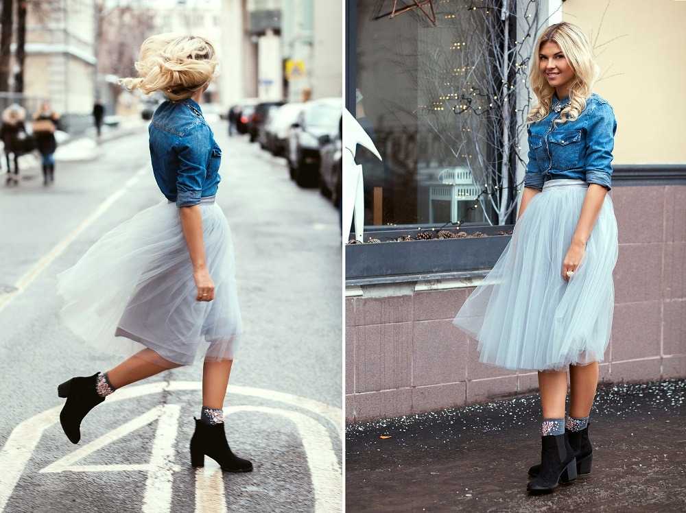 Голубой цвет распространяет прохладу среди знойного лета, а в зимнее время года придает образу нежности. Длинная юбка из фатина олицетворяет чистоту и целомудрие. Подобные оттенки являются самыми распространенными в индустрии моды. Хоть цвет и универсален, фатиновую юбку предпочтительно сочетать с приглушенными оттенками.