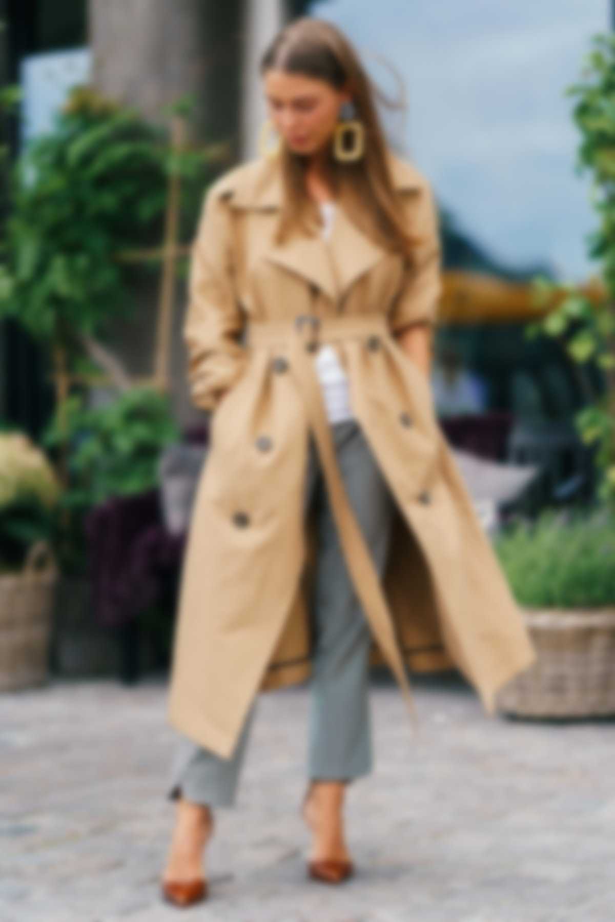 В осенне-зимних луках много бежевого цвета. Его оттенки нашли применение в брюках, шубах, обуви. Трендовым считается тренч бежевого цвета. В уличной моде Италии 2020 года активно используется бежевое пальто. При этом в моде изделия как бледного тона, так и насыщенного оттенка кэмел.