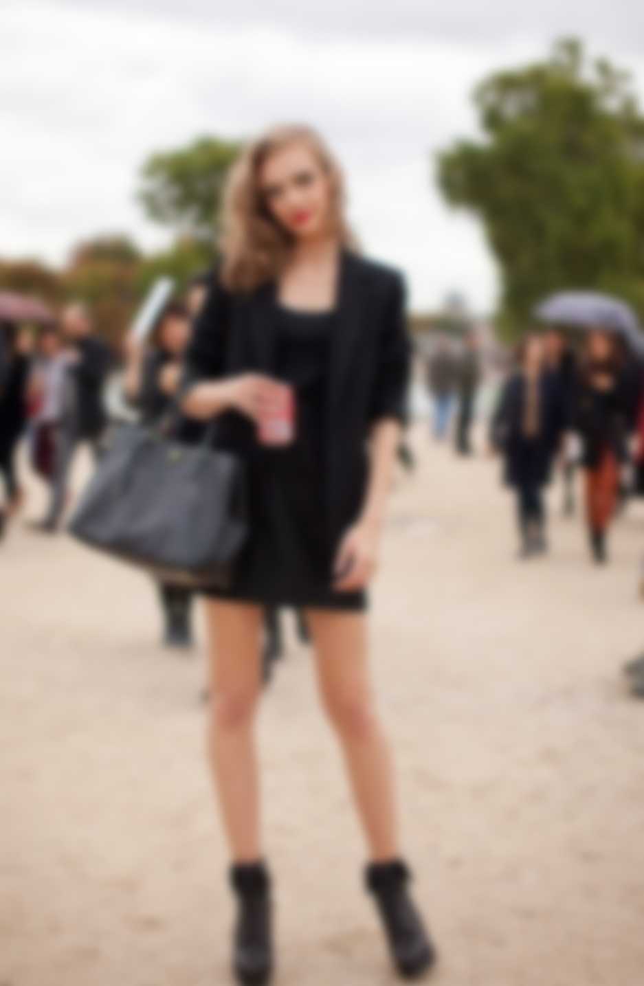 Для необычного образа street style можно надеть нежное платье с обнаженными плечами, однотонный пиджак и грубоватые ботинки на низком каблуке.
