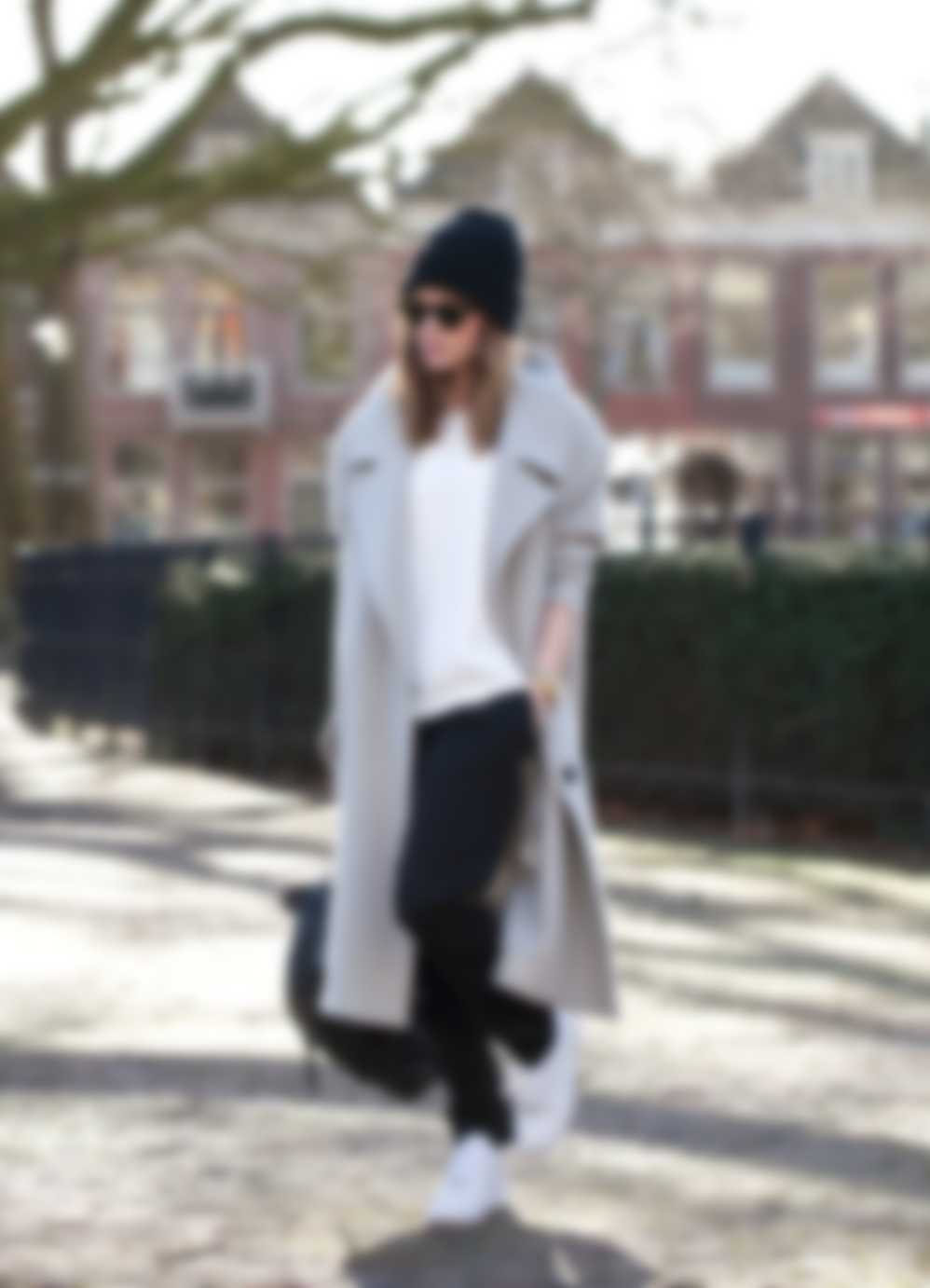 Прямые брюки, свитер и длинный однотонный плащ в пол – отличный вариант на каждый день. Плащ можно выбрать одного из трендовых в этом году оттенков, например, пыльного денима.