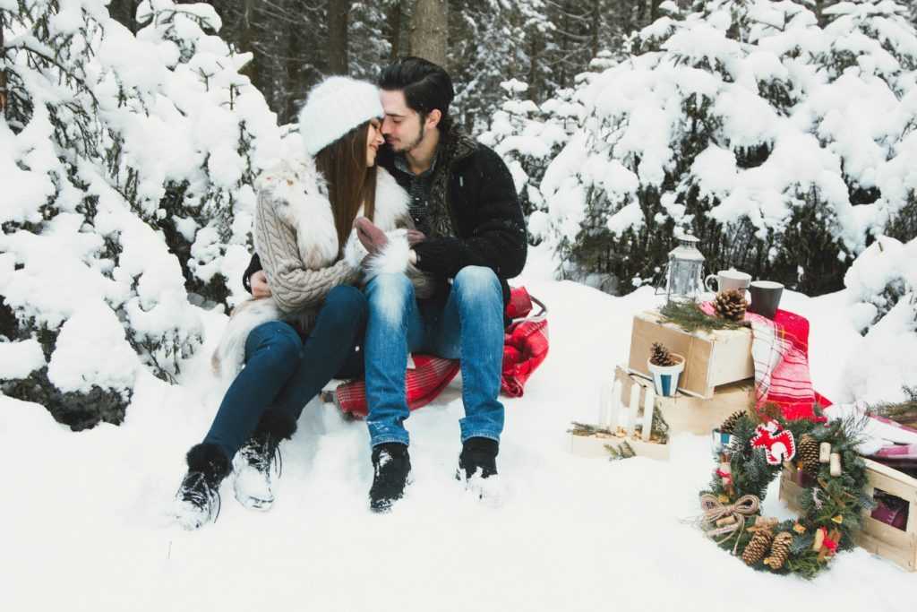 Парк или заснеженный лес. Здесь можно устроить такие же зимние забавы, нарядить елку взятыми с собой игрушками, развесить на деревья мандарины, подарить друг другу подарки, разнообразить процесс яркими хлопушками и бенгальскими огнями. Можно припасти заранее срубленную елочку (исключительно по разрешению) и снять, как участники съемки везут ее по лесу.
