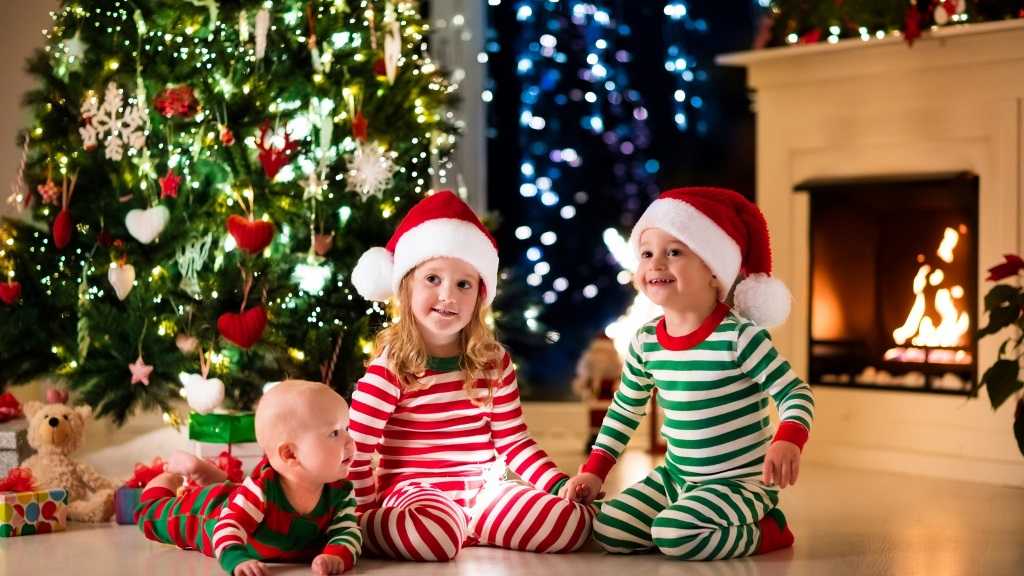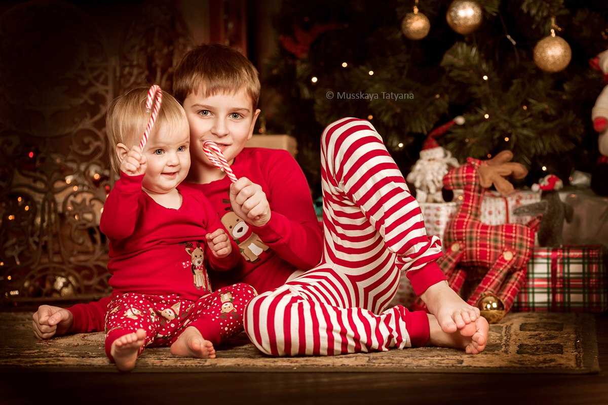 - Домашние пижамы: такой подход используется не часто, но дети получаются особенно милыми в симпатичных рождественских пижамках с оленями, снеговиками или снежинками. Главное: пижамки должны быть в одном стиле и сочетаться с фоном.
