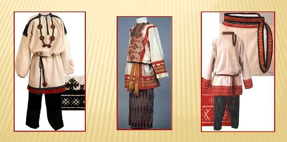 - В любом костюме обязательно присутствовал такой обязательный элемент, как пояс. Его главной функцией являлось поддерживание одежды. Кроме того, именно за пояс русские мужики засовывали ножи и топоры. В некоторых частях России пояса расшивались обережными орнаментами и символами;