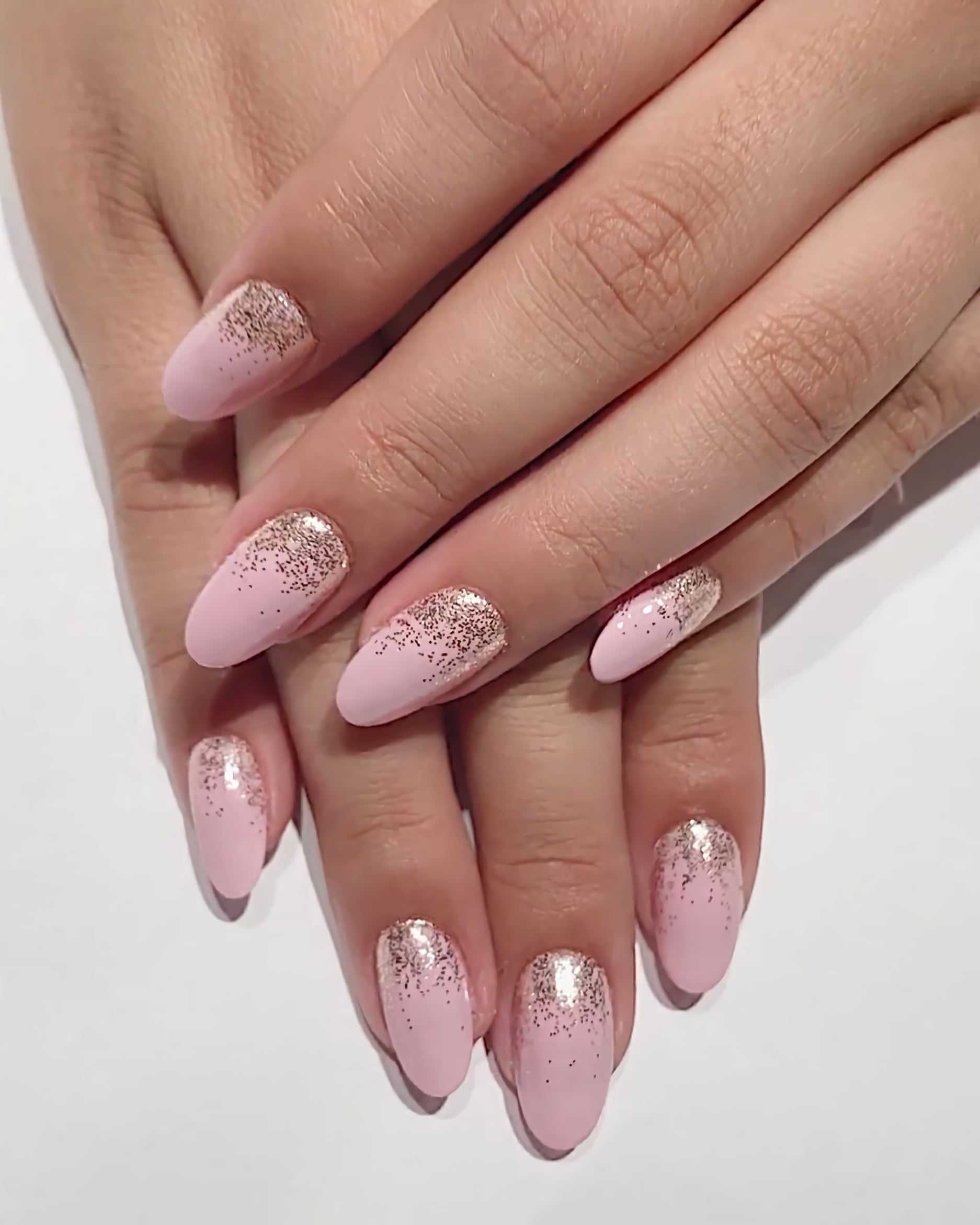 - В том случае, если хочется получить более нарядный вариант предельно простым способом, предыдущий вариант просто декорируется плотным глиттером. Им прорисовывают лунку. Но здесь есть тонкости – полукруг должен быть небольшим, скромным, а сам глиттер сложного оттенка розового золота. Получается просто, стильно и очень элегантно.