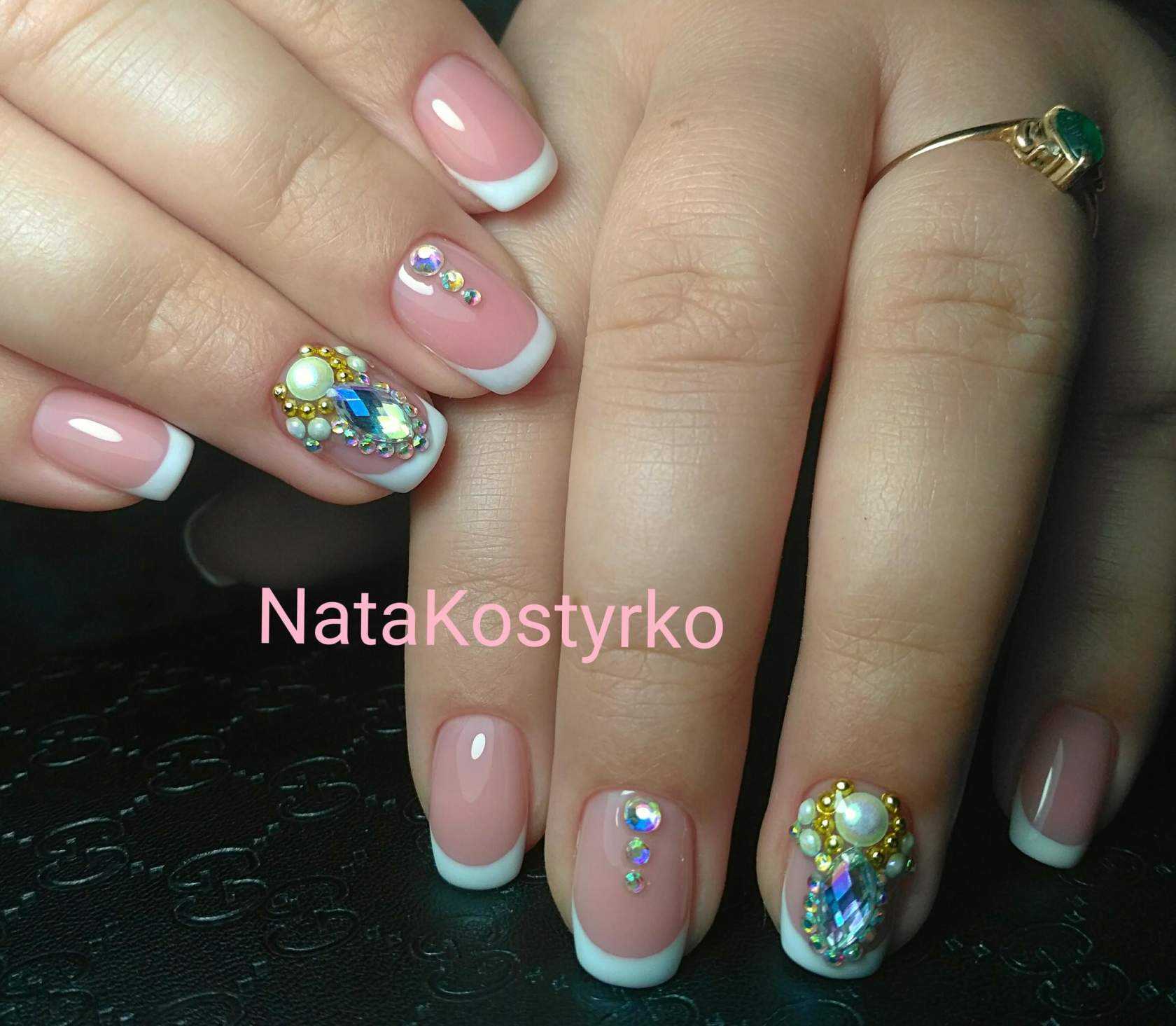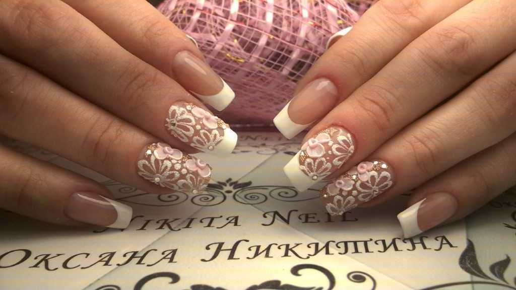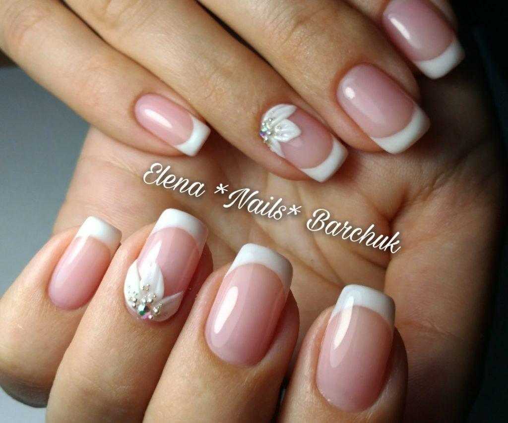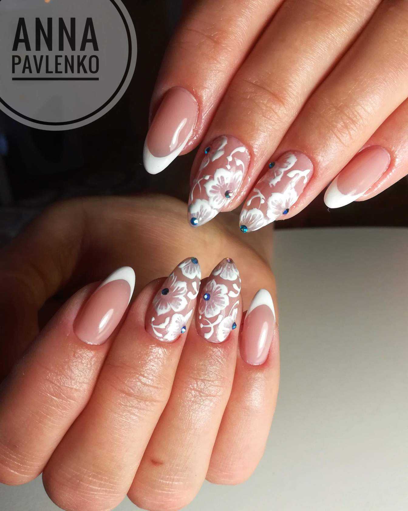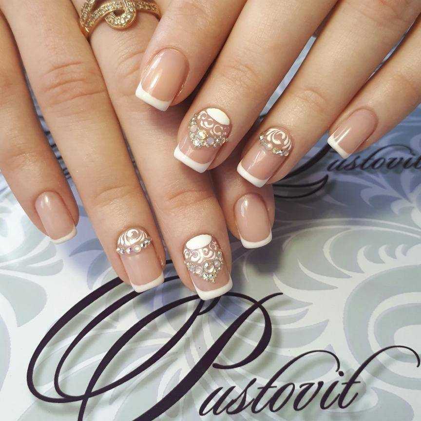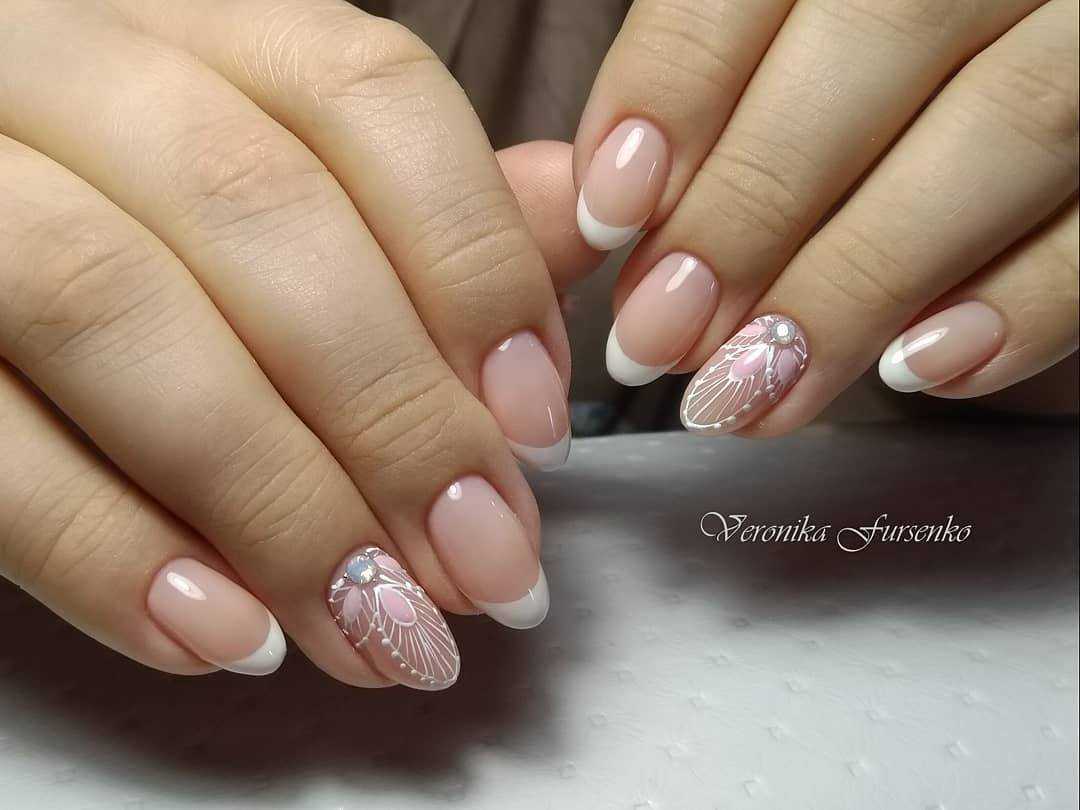 Обычно он дополняется кружевными узорами, флористическими мотивами, художественной росписью, стразами. Такой вариант всегда популярен, так как отличается скромностью и изяществом. Такой маникюр идеально подходит для длинных и средних ногтей. Классические оттенки – полупрозрачный розовый, бежевый, молочный, нюдовый.
