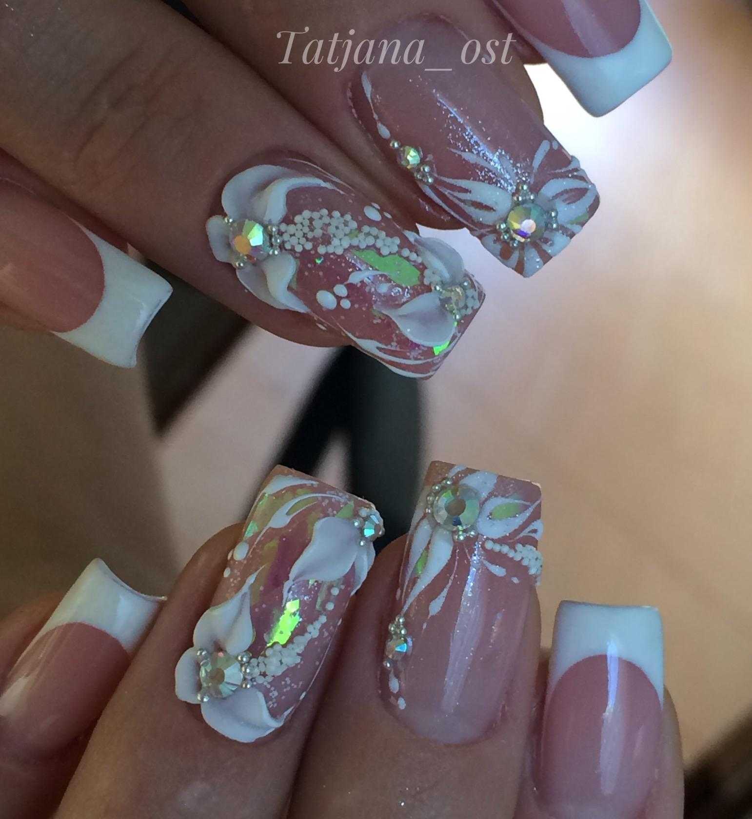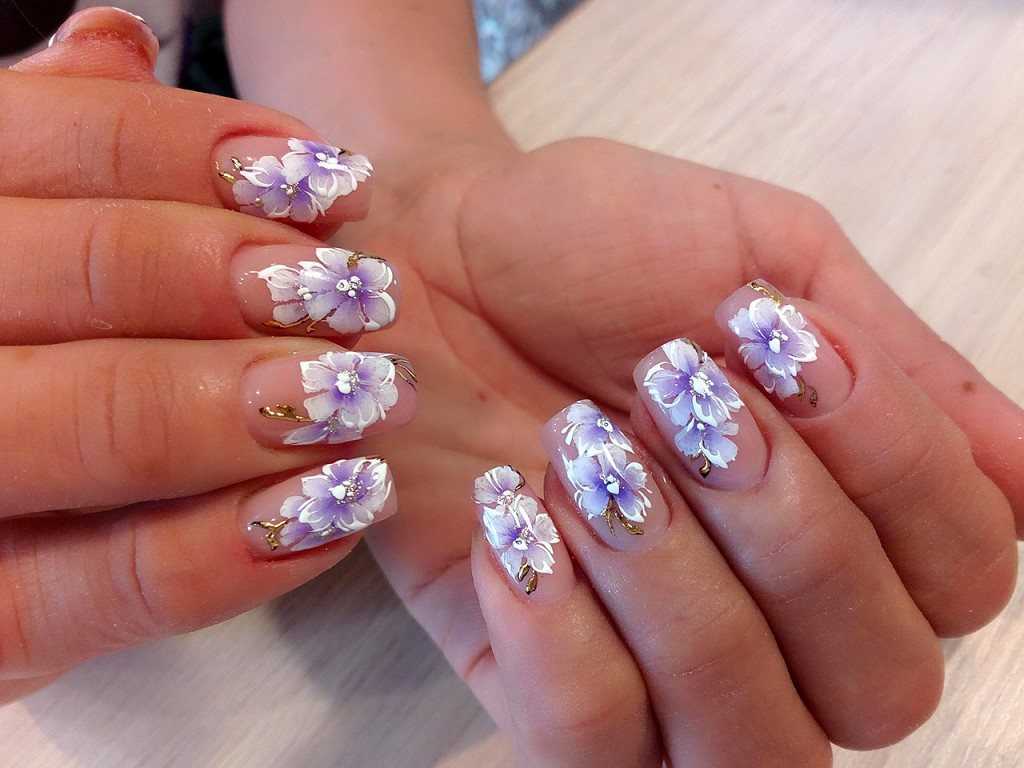 Свадебный маникюр с цветами также выполняется на длинных и коротких ногтях. Это может быть рисунок или россыпь камней, уложенная в витиеватый узор, подчеркивающий роскошь образа.