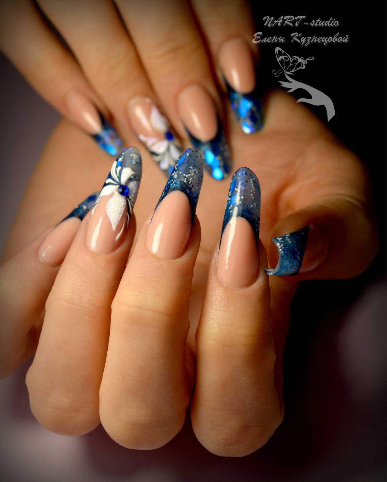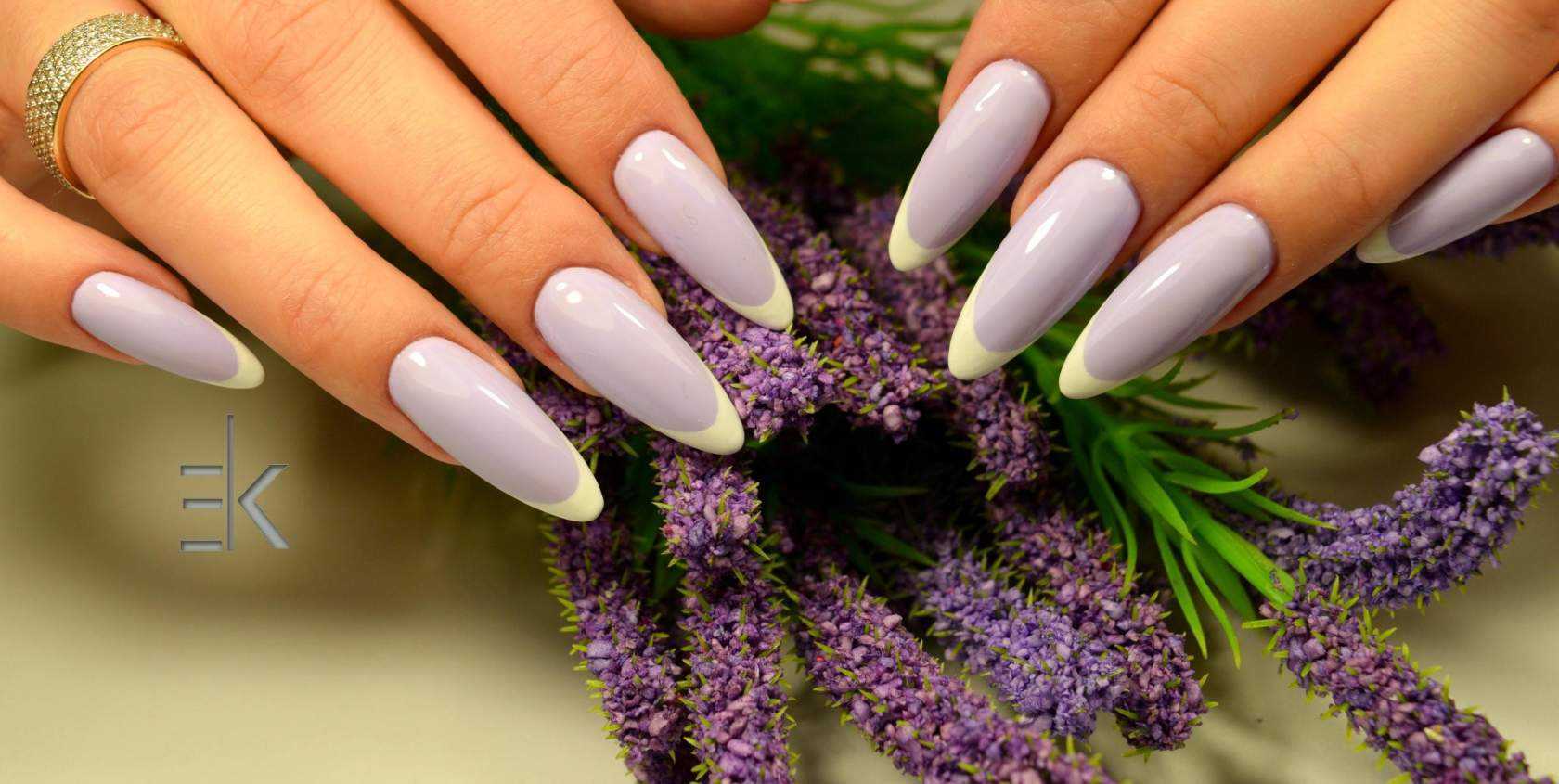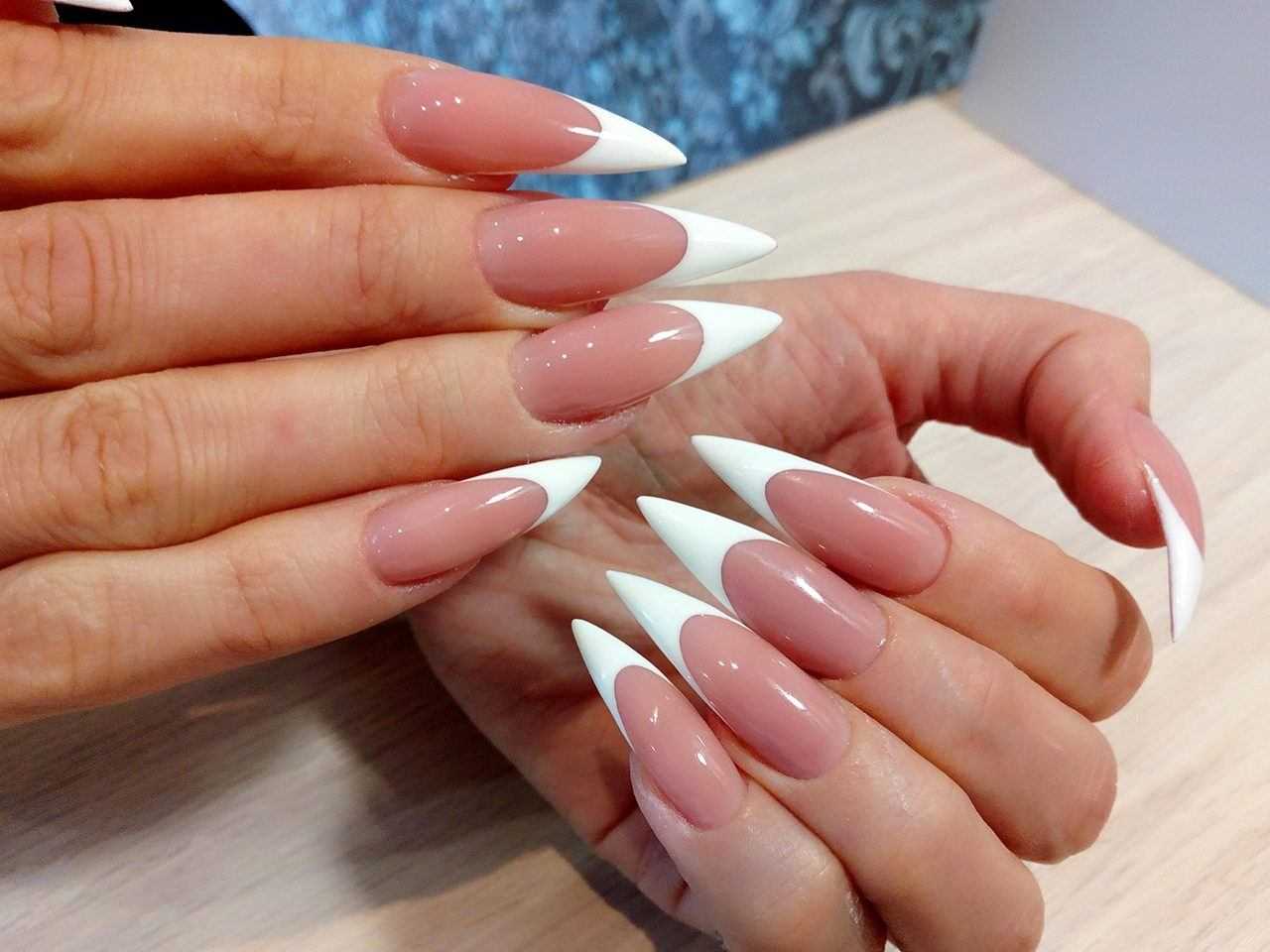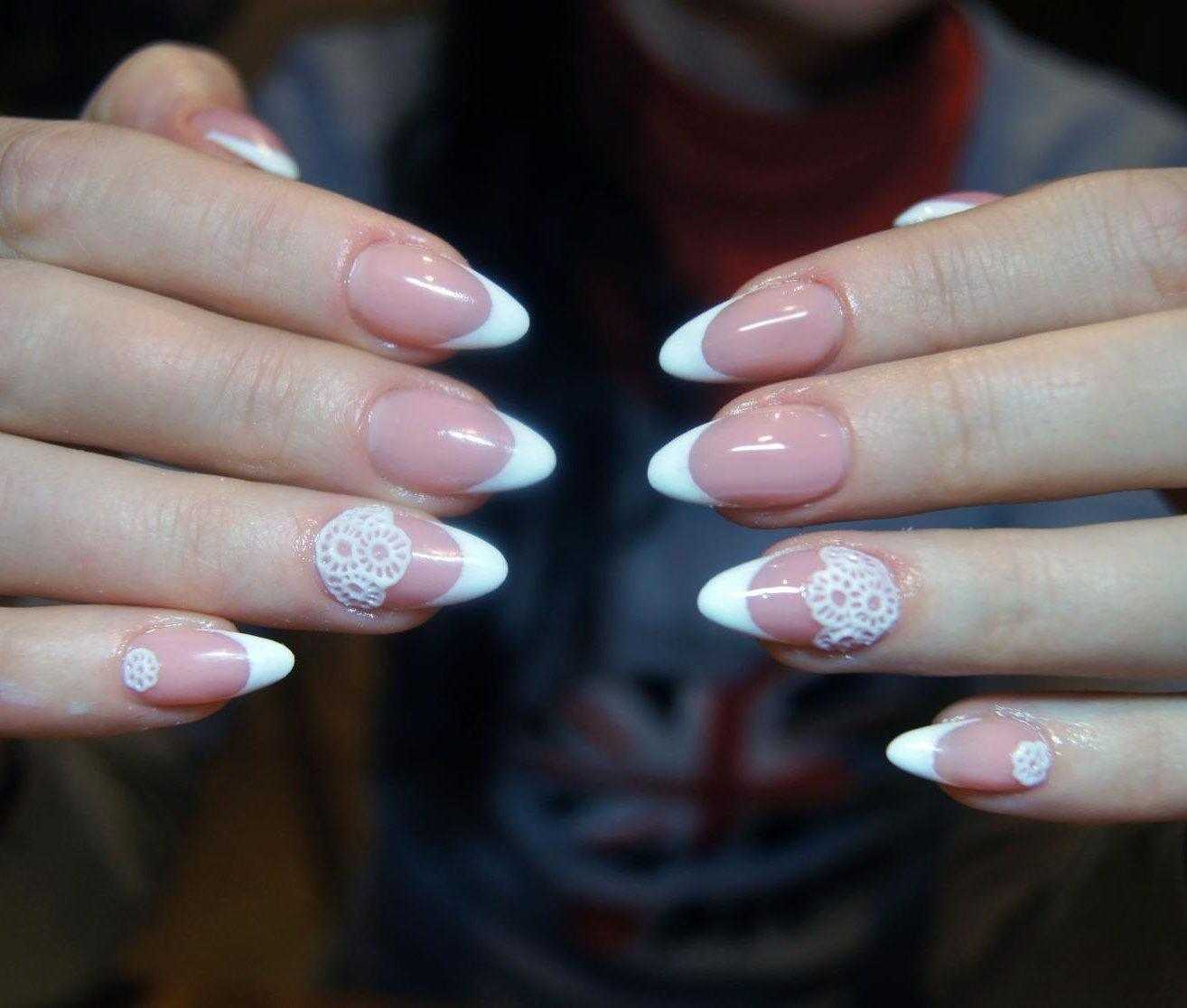 Острые ноготочки отлично подходят для любого образа. Френч, на данной форме ногтей, будет смотреться очень изысканно за счет своего низкого расположения с высокими линиями улыбки по краям. Благодаря такому решения ногтевое ложе удлиниться, сделав пальцы аристократичными.