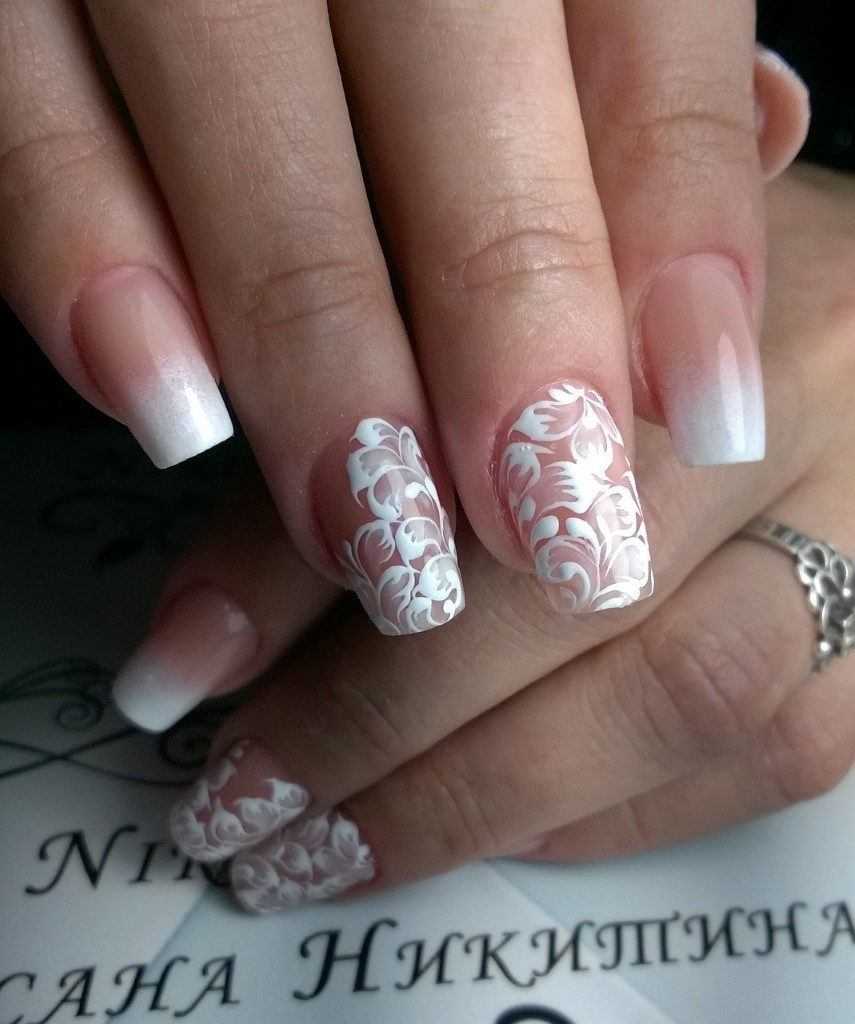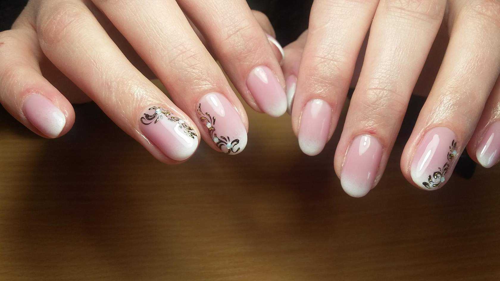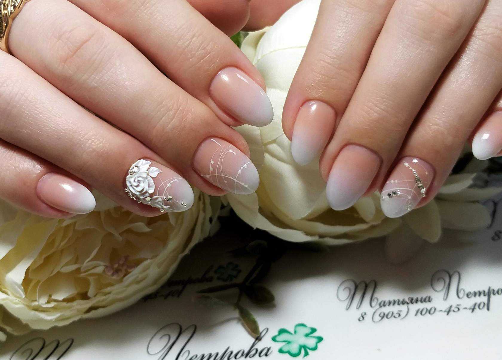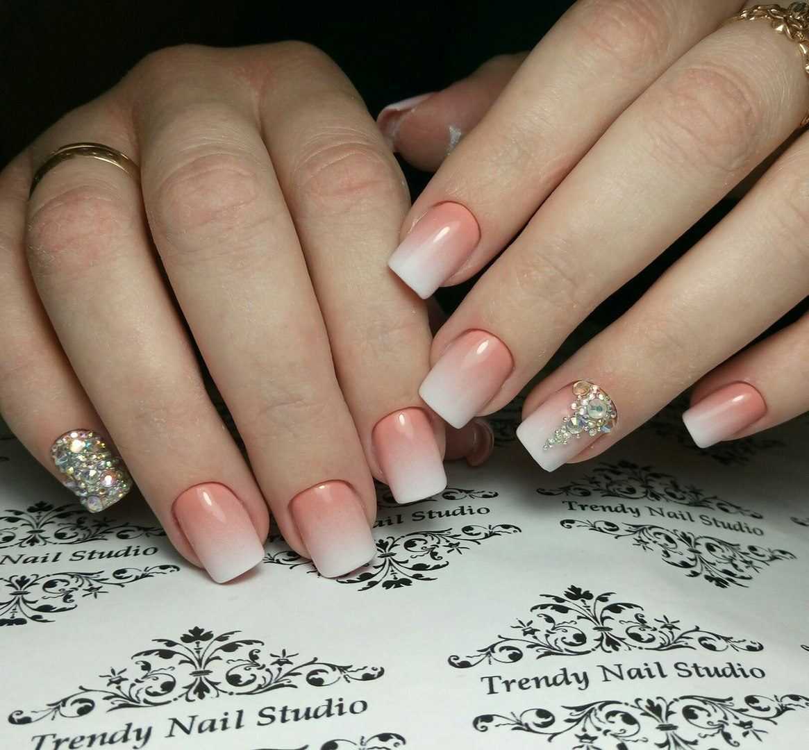 Это красивый и нежный переход цвета, который смотрится очень утонченно на ногтях любой длины. На свадьбу принято его делать в нюдовых оттенках, а дополнить дизайн можно чем угодно: и лепкой, и стразиками, и вензелями.