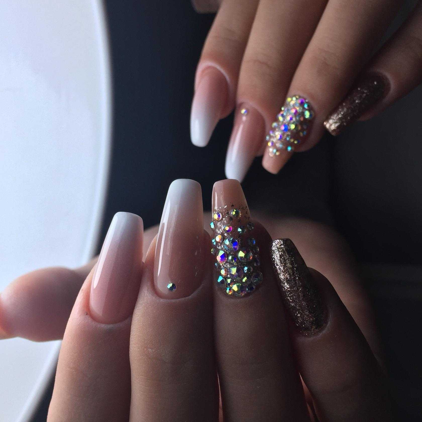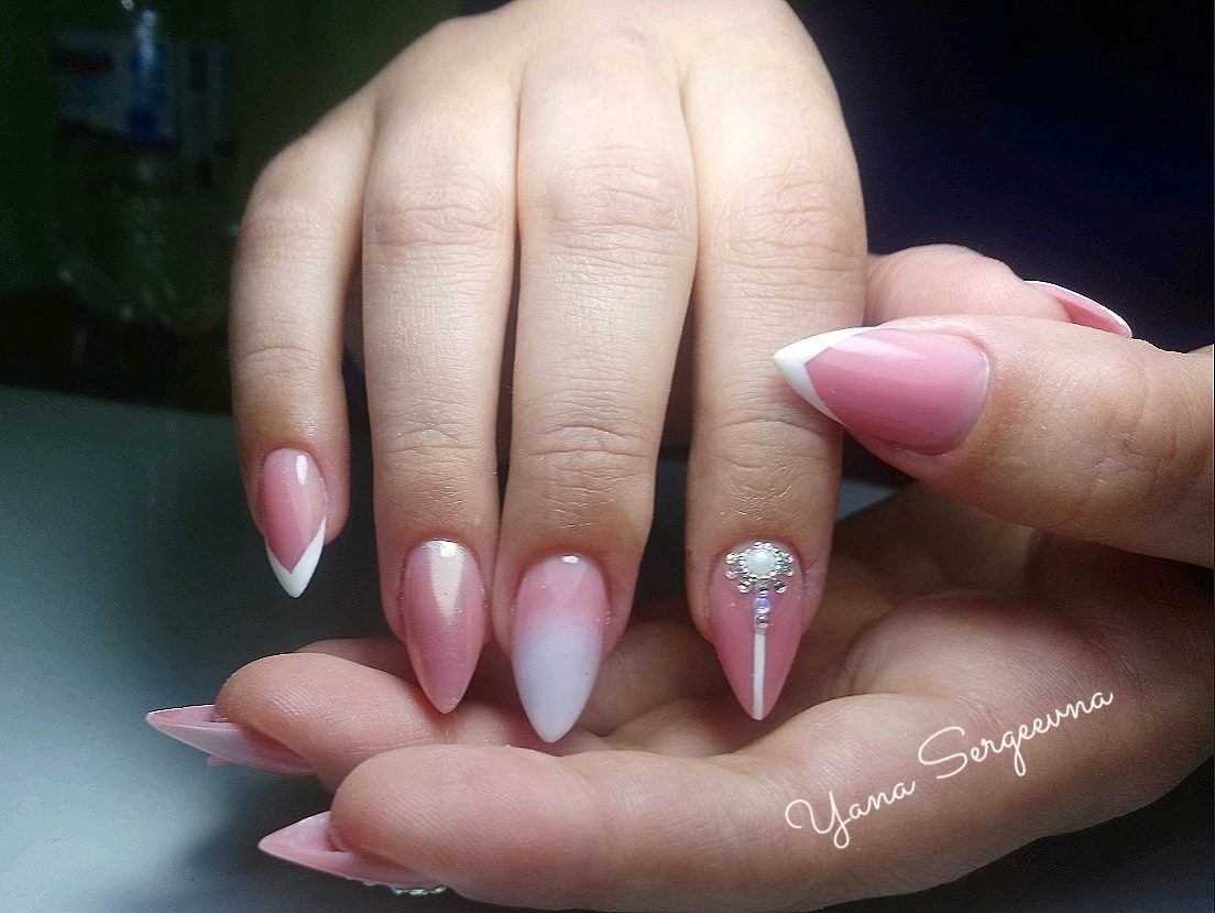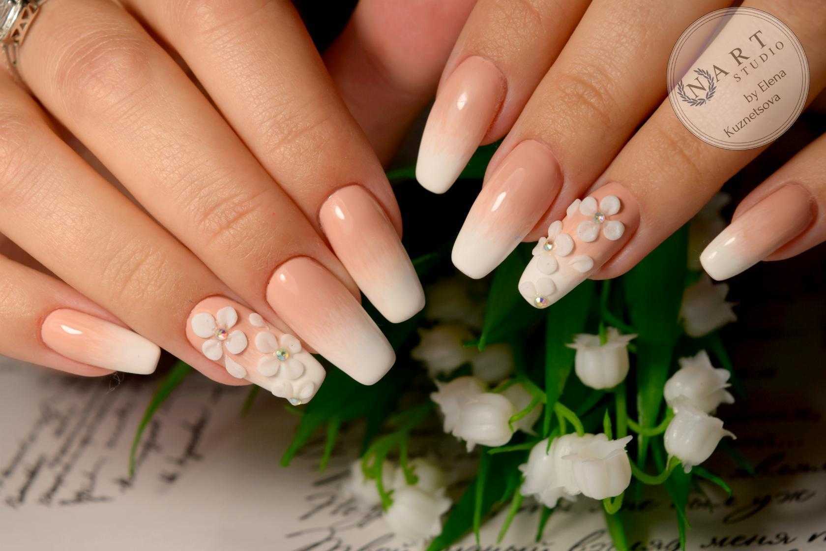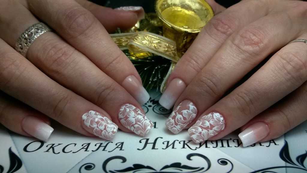 Это красивый и нежный переход цвета, который смотрится очень утонченно на ногтях любой длины. На свадьбу принято его делать в нюдовых оттенках, а дополнить дизайн можно чем угодно: и лепкой, и стразиками, и вензелями.