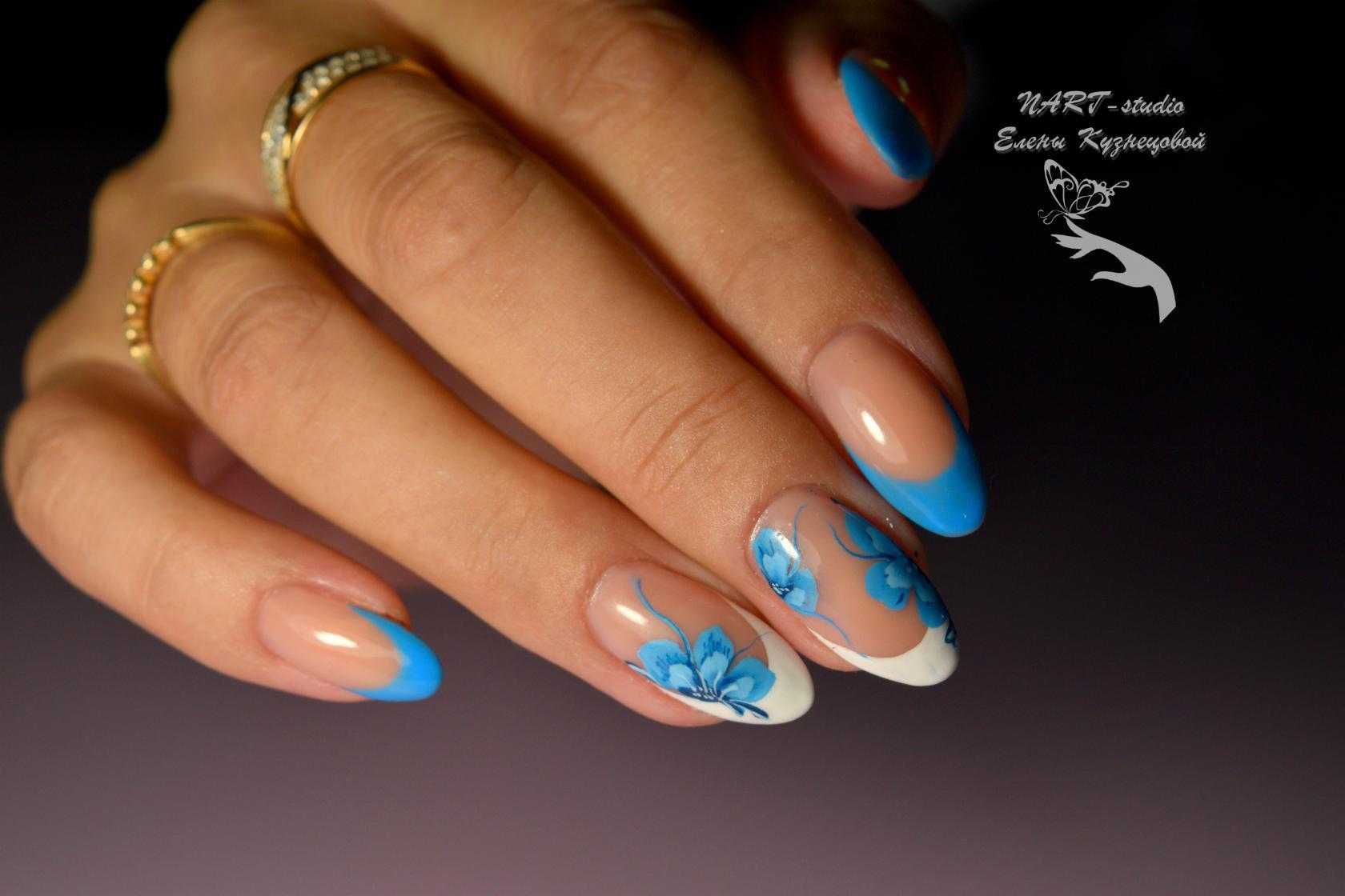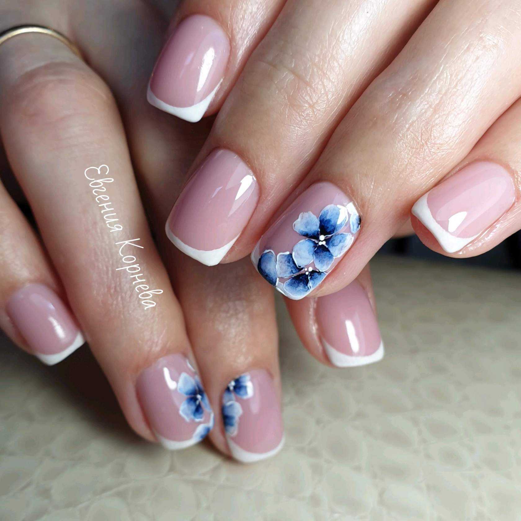 - Голубой и розовый – идеальные цвета для создания омбре. Чтобы уменьшить цветовую нагрузку, делать двуцветный вариант можно не на всех пальцах. Стильный и модный облик придаст матовое топовое покрытие. Один из ногтей можно украсить акварельным стилизованным изображением цветов.