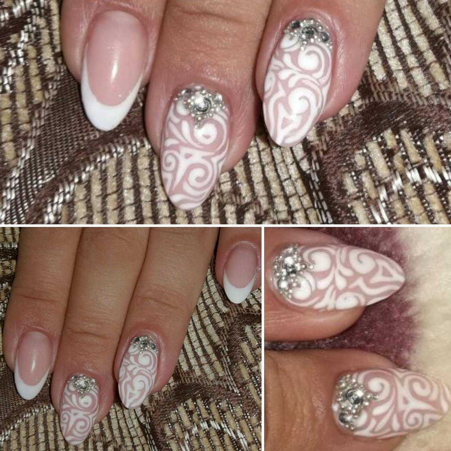 Еще один популярный и часто выбираемый дизайн для свадебного торжества – это рисунки в виде вензелей. Очень нежно сочетать их с френчем, стразами небольшого размера и с белым цветом.