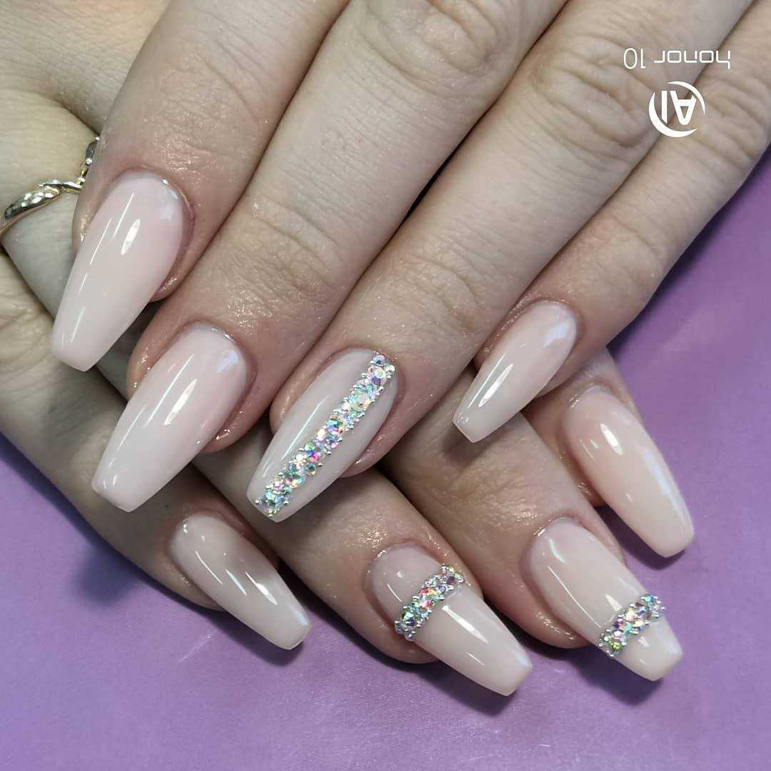 Здесь нас учат, насколько потрясающе может выглядеть балетно-розовый маникюр, просто добавив несколько драгоценных камней у основания каждого безымянного пальца.