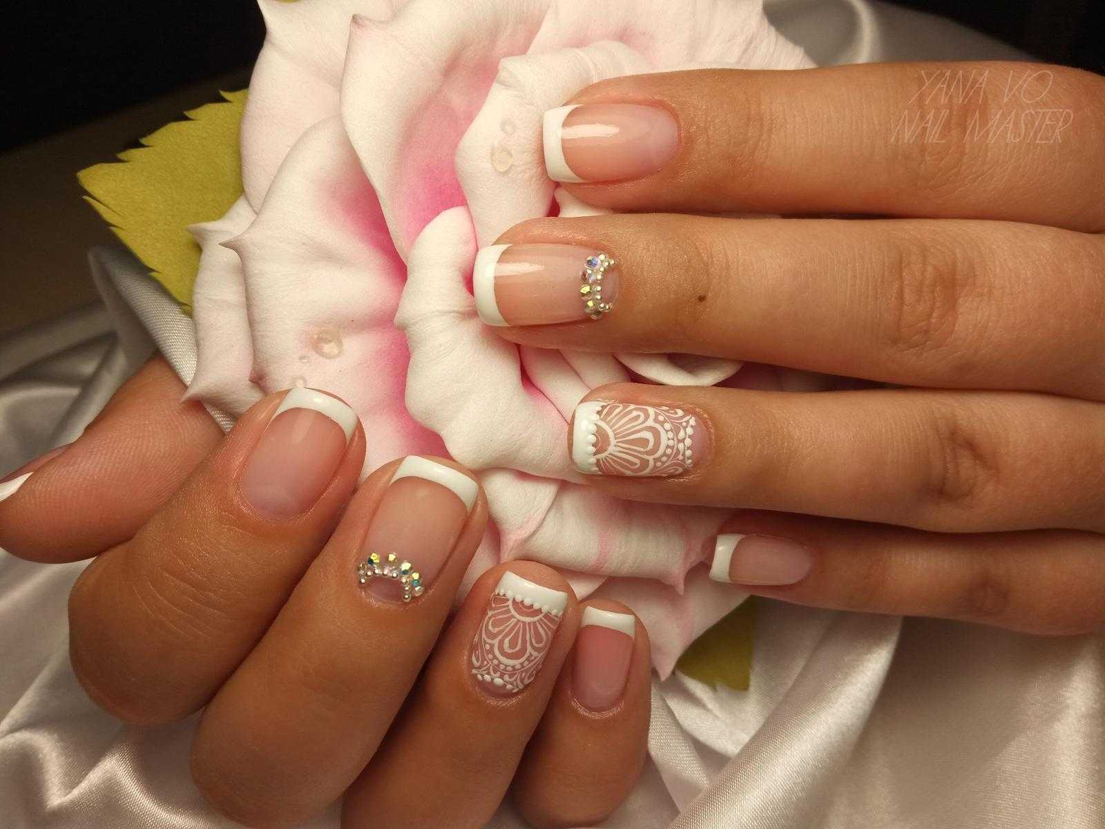 Французский дизайн ногтей на свадьбу самый популярный на протяжении многих лет и хоть сейчас уже полно новинок в мире маникюра, все равно большинство невест до сих пор отдают предпочтение именно френчу. Дополнить его можно кружевными узорами, стразами, цветами, бантиками, росписью и даже яркими оттенками.