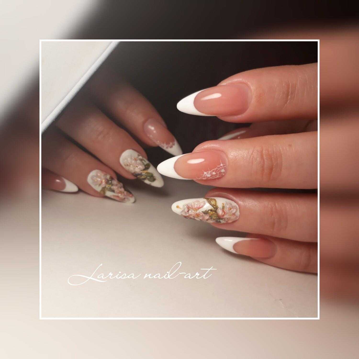 Длинные ногти невесты гармонично дополнит романтический рисунок, симметрическая геометрия или же классический амбре. В повседневной жизни редко встретишь идеальную миндалевидную или овальную форму ногтей. Именно потому все большую популярность набирают формы пуантах, которые часто показывают бьюти-блоггеры. Такую форму тяжелее сломать, и она более удобна в быту.