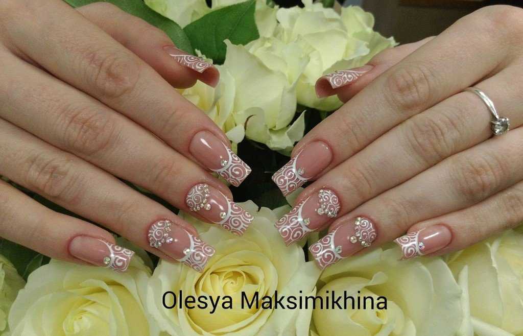 Классический французский маникюр сразу становиться свадебным дизайном ногтей, как на фото, если к нему добавить вензеля. Витиеватые узоры на некоторых ногтях добавят нежности образу невесты.