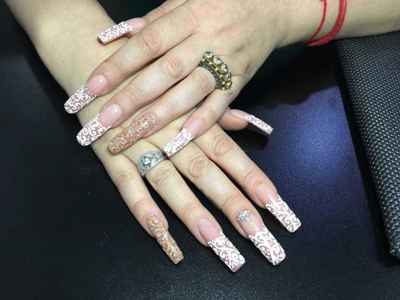 Креативные дизайны на белых длинных ногтях, с черной росписью.