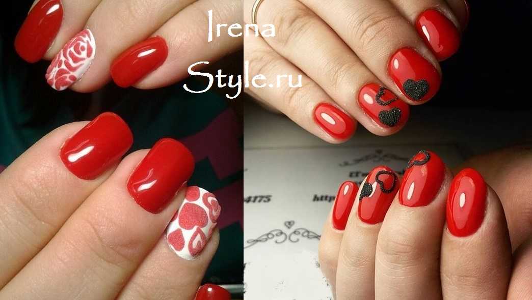 Покрасьте ногти красным лаком. Возьмите черный лак. На каждом ногте нарисуйте сердечки, но, чтобы они отличались друг от дружки. К примеру, на указательном пальце нарисуйте несколько мелких сердечек, а на большом пальце нарисуйте одно большое сердце, украшенное блестками.
