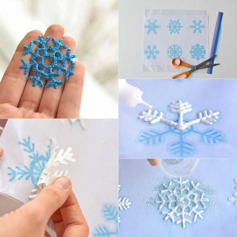 Взять вощеную бумагу, смазать средством для мытья посуды и нарисовать клеем из пистолета снежинку. После того, как клей засохнет, аккуратно отделить от бумаги, смазать ПВА, приклеить ниточку, за которую можно будет повесить на елку, засыпать блестками. Готово!