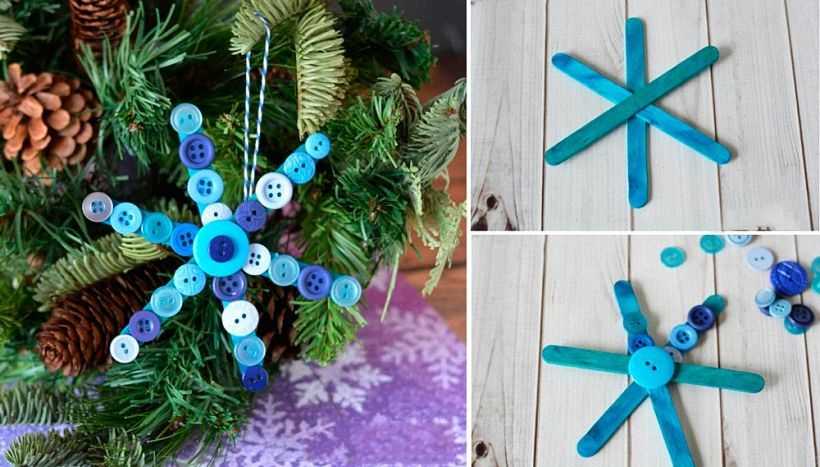 Можно брать от 4 до 8 палочек от мороженого и склеивать между собой. Затем на них приклеить пуговицы. В итоге закрепить ниточку и можно вешать снежинку на елку.