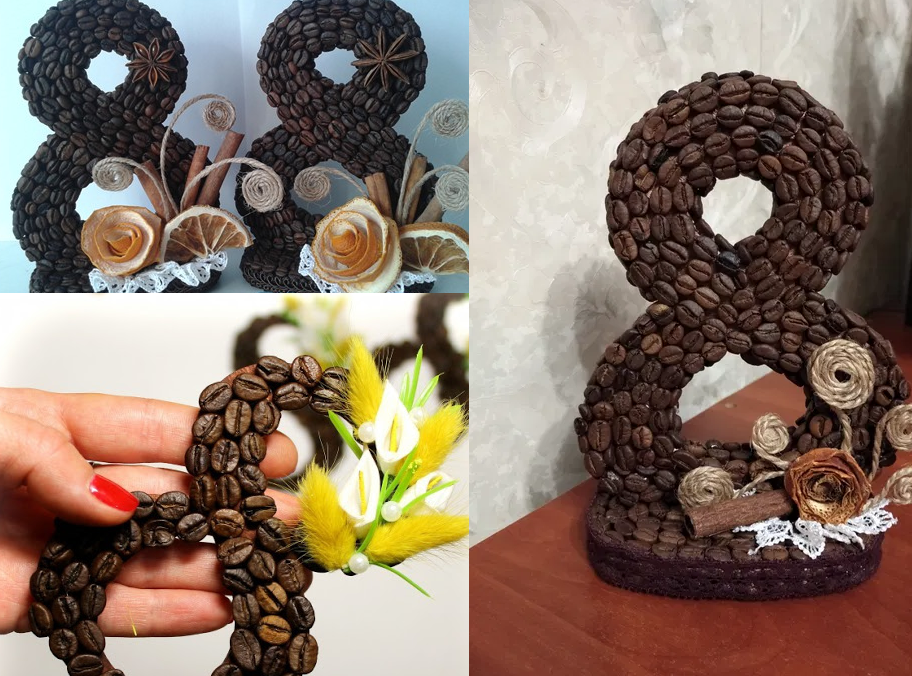 Цифру из кофе можно дополнительно украсить завитками из джута, цветами из кожуры мандарина, палочками корицы и звездочками бадьяна.