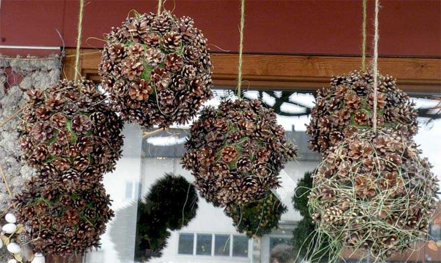 Украшения из шишек на Новый год могут быть выполнены в следующих видах: