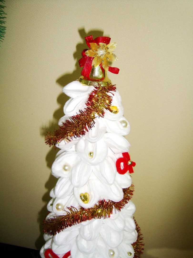 После того, как гипс высохнет, можно начинать украшать елку. Из атласных лент смастерите пышный бант. Прикрепите бант на макушку елки вместо звезды.
