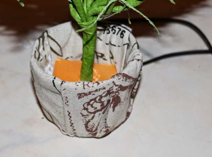 Очертания выравниваем ножом, просто срезаем, придавая сооружению форму конуса. У меня получилась ракета)) Под горшок кладем тряпку, из флористической губки может выделяться лишняя вода.