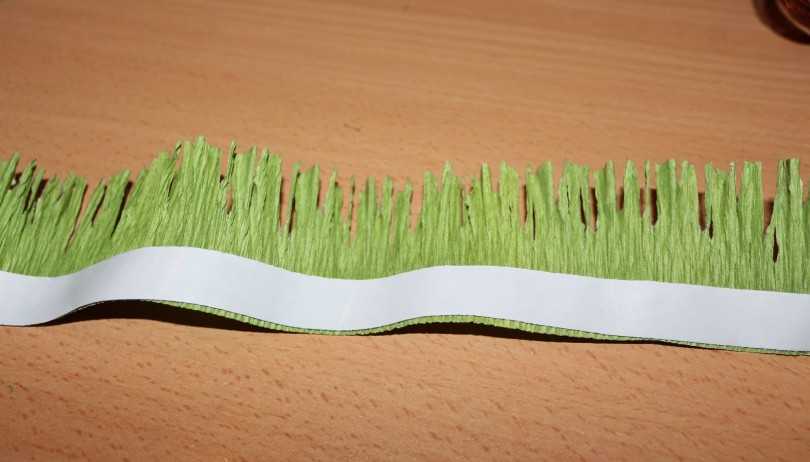 3. Из гофрированной бумаги нарежьте полоски шириной 5 см. А затем прошейте их ниткой по всей длине так, как показано на картинке ниже.