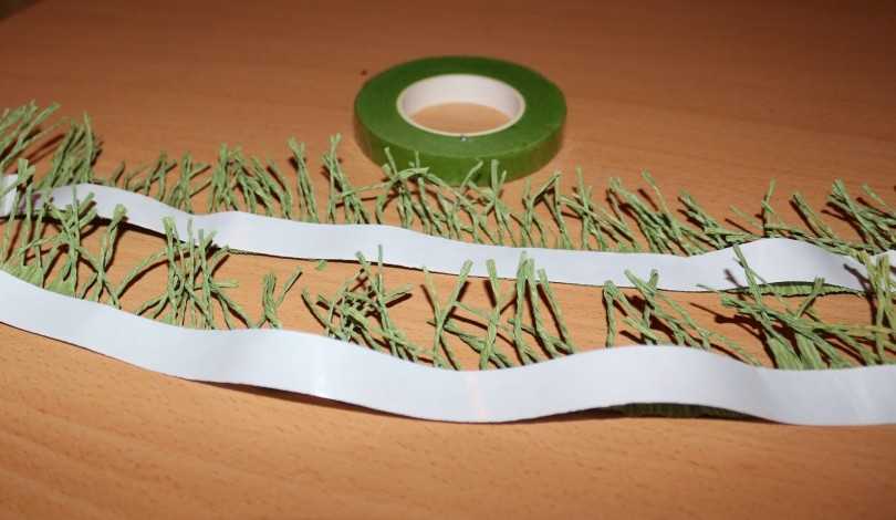 Берем ветку 1 вида, в которой 5 петелек, размещаем её на самом верху и закрепляем теп лентой (флористической). Обматывать следует хорошо, чтобы не было видно просветов. Чуть ниже закрепляем ещё 3 ветки первого вида. Так же проходимся лентой.