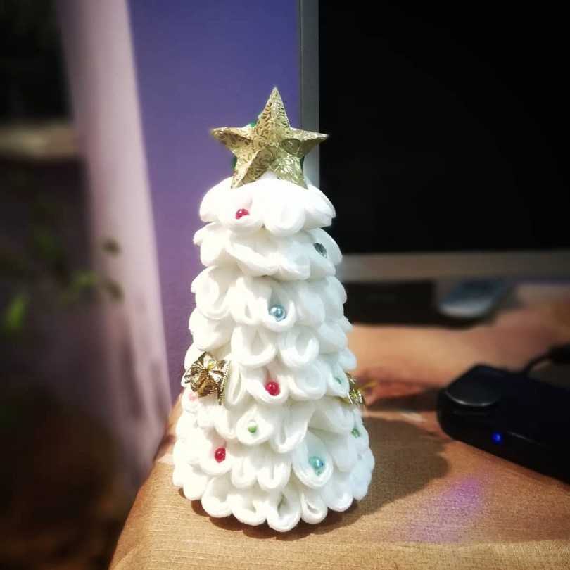 Клеим пушистые «лапки». Двигаться необходимо по кругу. Если требуется, детали можно подрезать. Расстояние между слоями выбираете индивидуально. Добавляем декорирование в виде бусинок. Фиксируем горячим составом. Верхушку дополняем звездой.
