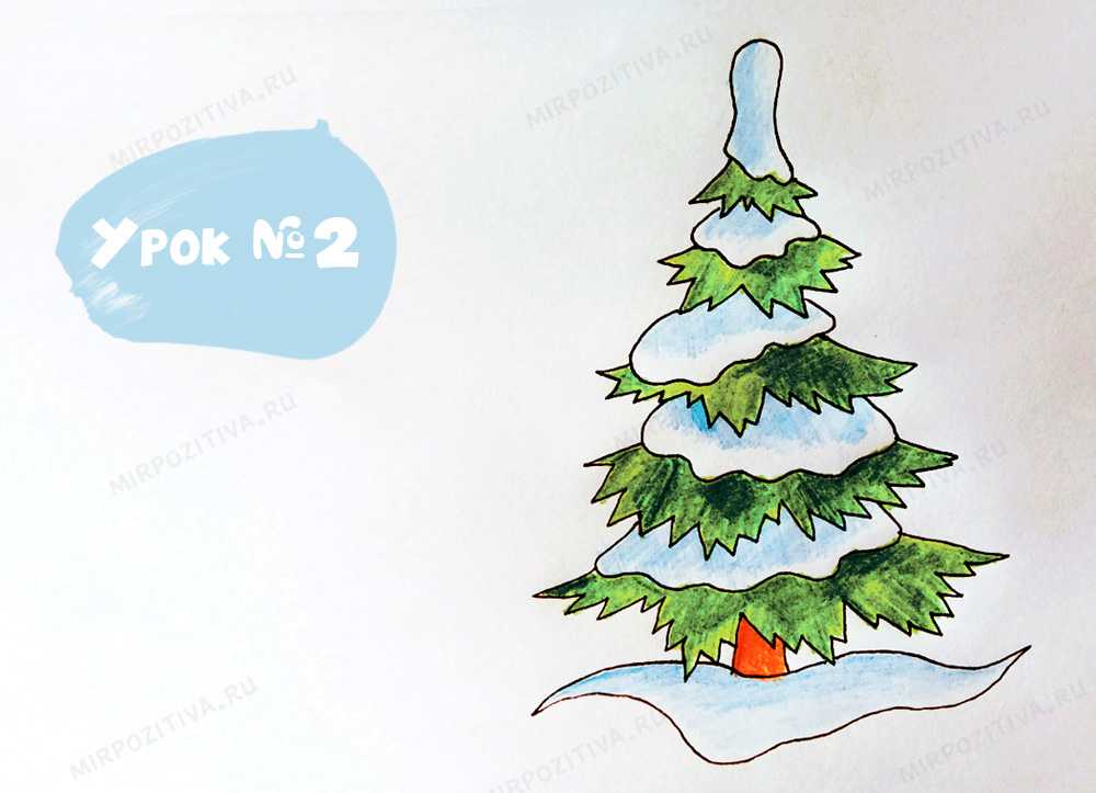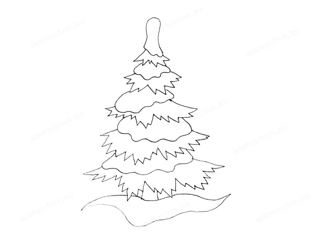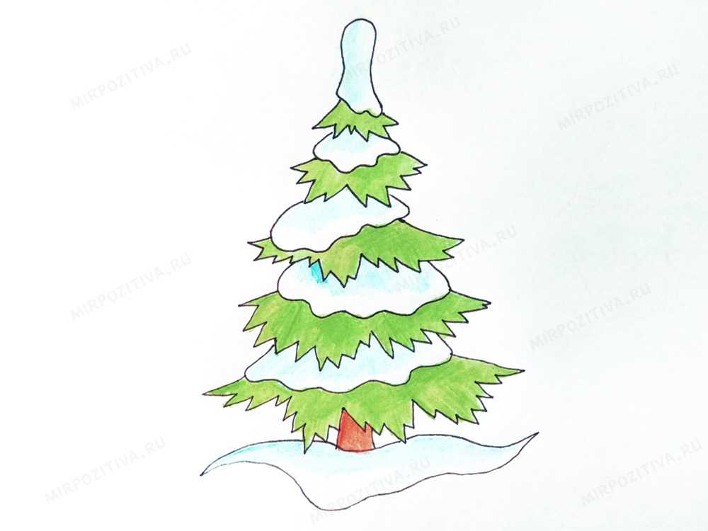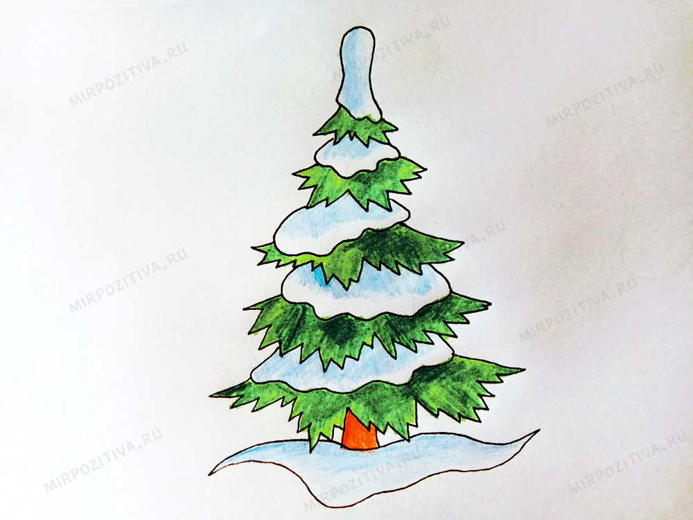 Следующий вариант елки также будет скорее сказочным, нежели реалистичным. Но мы немного обозначим ветви. А также рассмотрим, как нарисовать елочку под снегом.