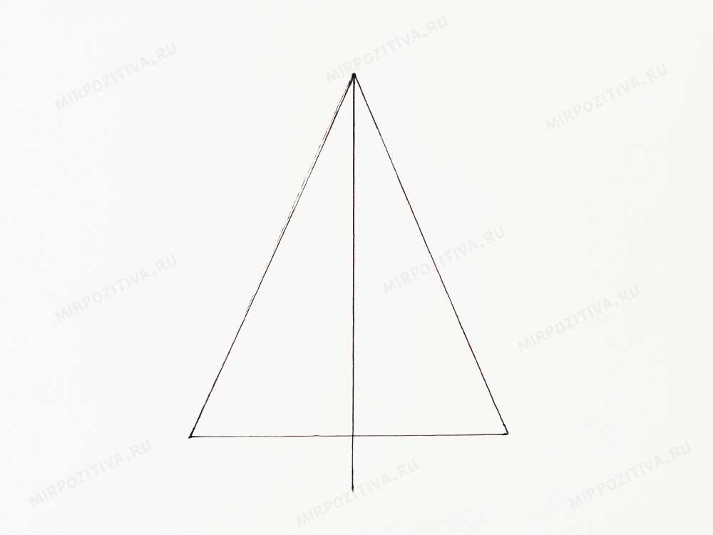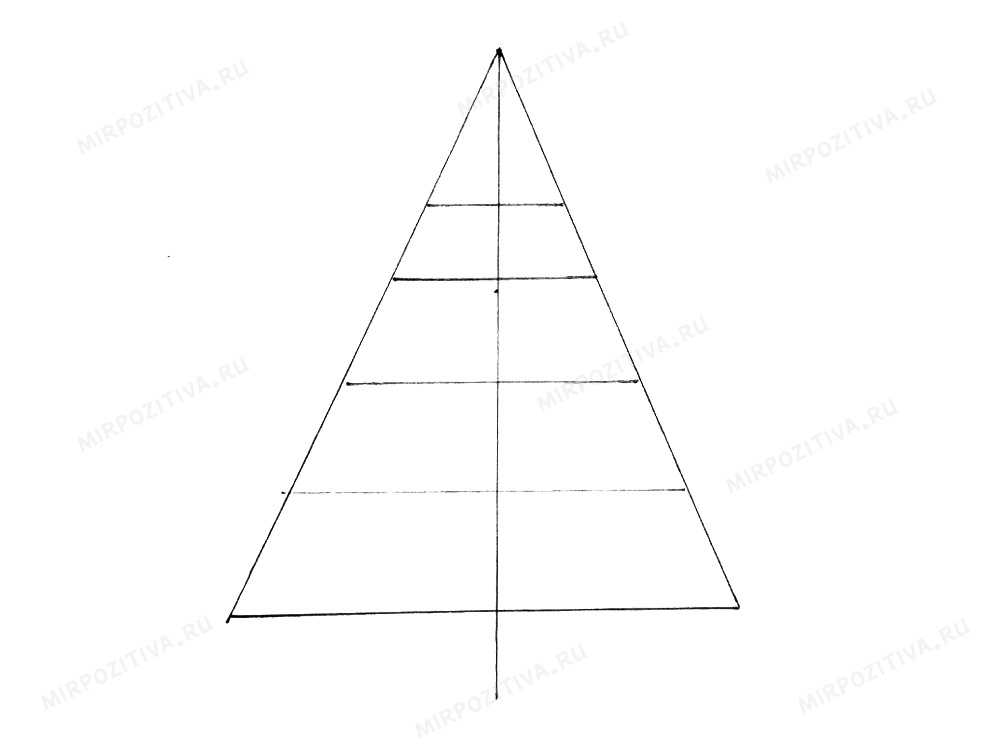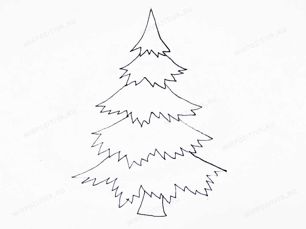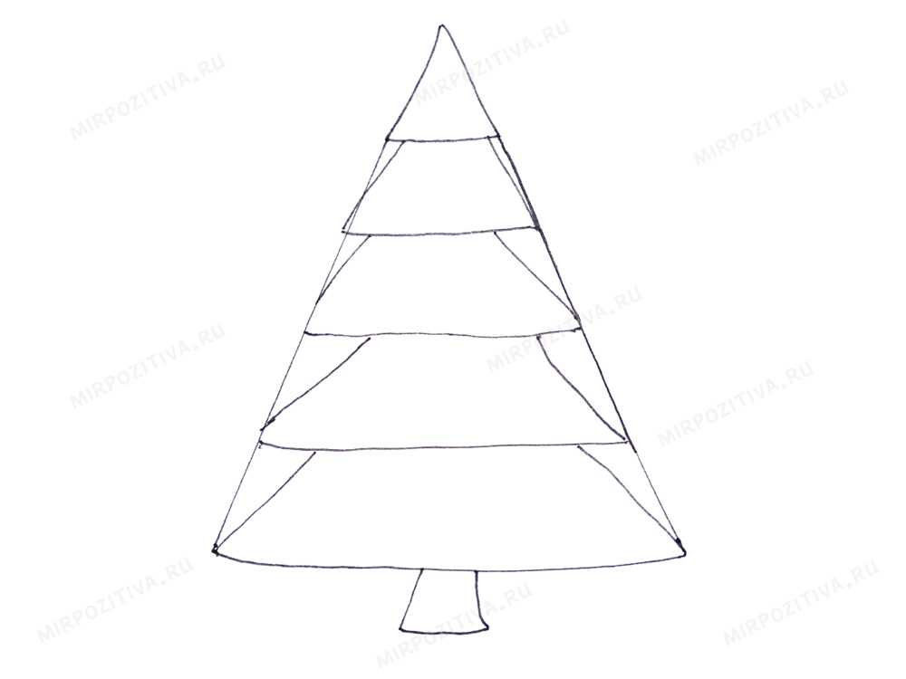 Треугольную макушку оставьте без изменений, а ниже отступите немного от верхнего края справа и слева, образуя уголки боковых еловых лап. Выделите края каждого яруса. Сотрите лишние линии.