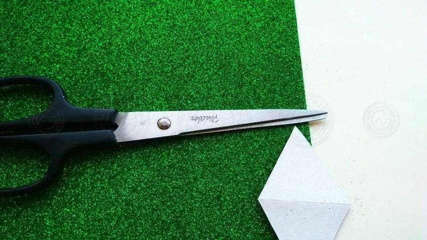 1. Подготовьте зеленый фоамиран, из которого будут выполнены лучики снежинки. Из картона вырежьте ромб и 2 противоположных угла в нем сделайте в 60 градусов.