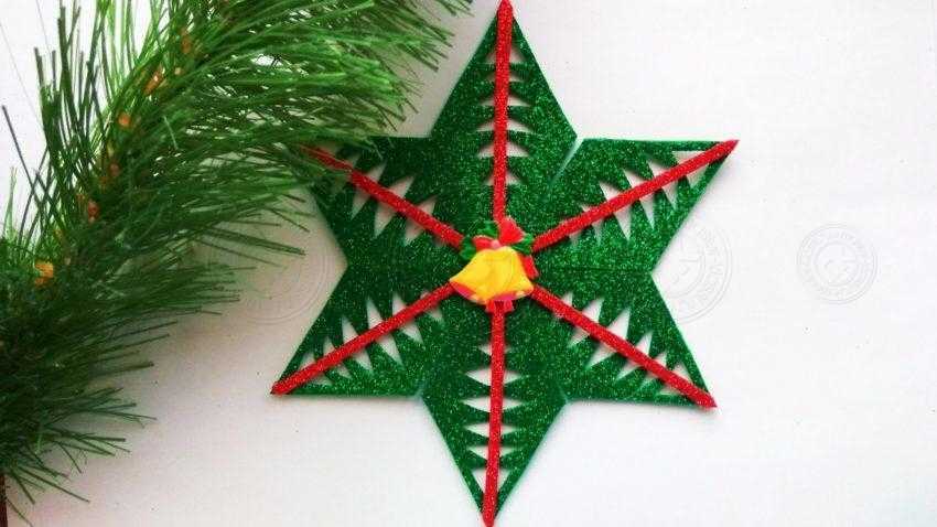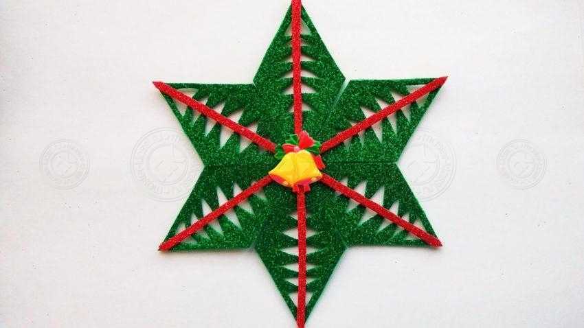 8. На вершинах снежинки полосы обрежьте, чтобы она смотрелась аккуратно, а серединку задекорируйте и замаскируйте кабошоном в виде колокольчиков. Эта модель отлично подойдет к данному варианту новогоднего украшения. 9. Снежинка из глиттерного фоамирана готова. Она яркая, комбинация цветов контрастная и отвечает новогодней тематике, поскольку лучики резные и зеленые, то модель действительно напоминает елочку. Мы добились нужного результата. На этом урок можно закончить. Если вы посмотрите на фигуру с обратной стороны, то она также будет смотреться интересно, только поверхность будет матовой, а не блестящей. Останется любоваться вашей поделкой и украсить ею интерьер. Новогодние эксперименты самые яркие и запоминающиеся для детей.